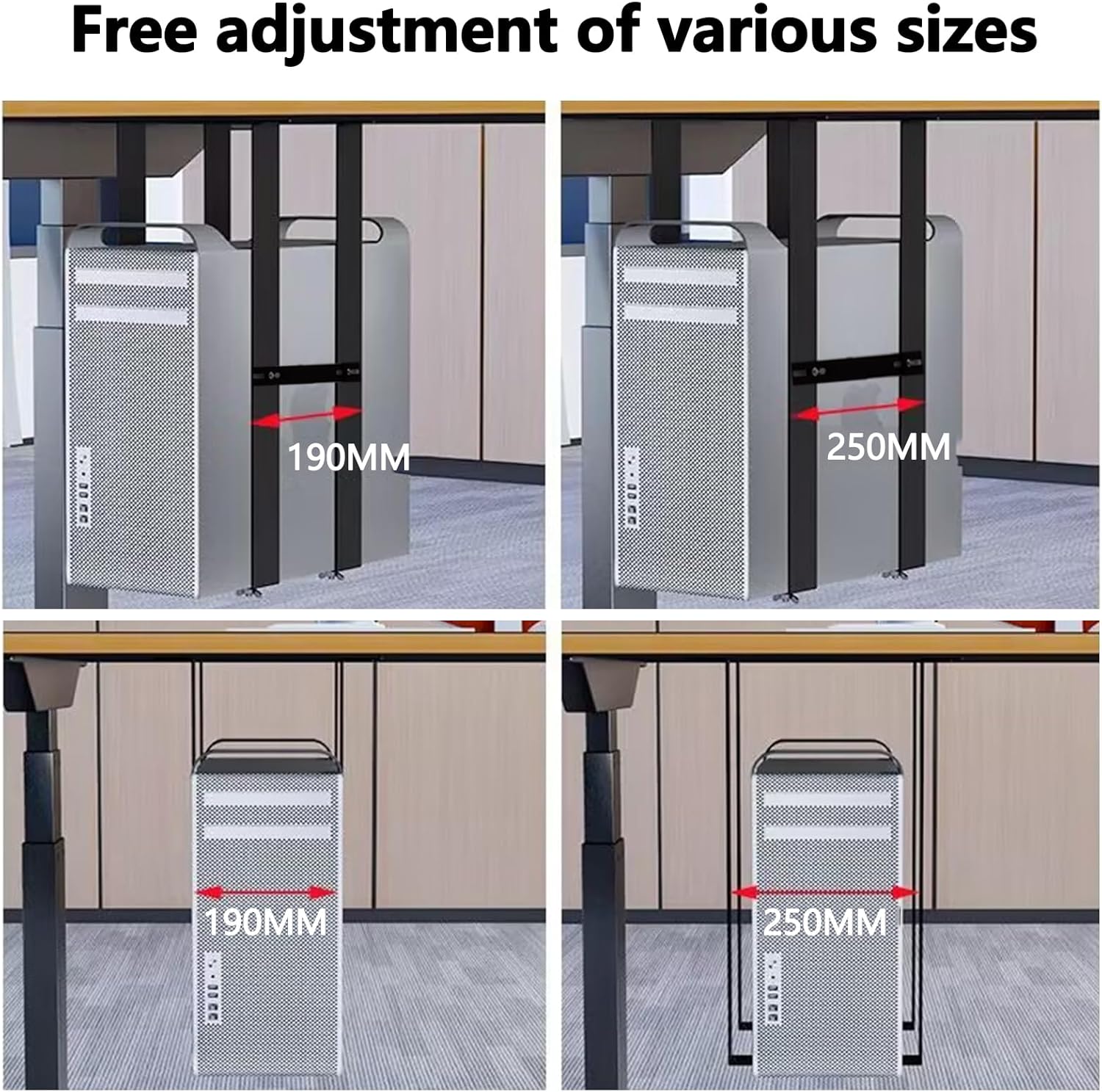 - Featuring a height of 520mm and width adjustable from 190-250mm, this PC DESK MOUNT fits 99% of computer host cases with a height less than 500mm and thickness between 130-240mm. The versatile design allows for customization to fit various desk setups.