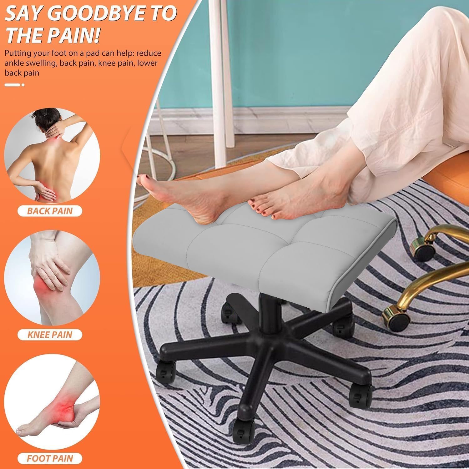 Footrest Under Desk Leg Rest Ottoman Adjustable Height Foot Stool with Wheels Leather Footrest Grey