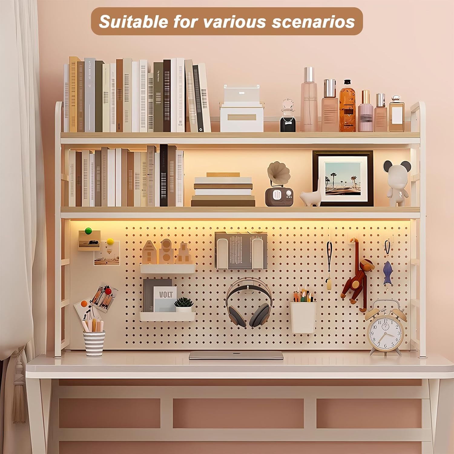 MDF Desk Hutch 2 Tier with Pegboard, Countertop Desktop Bookshelf, Storage Organizer Rack for Office, Home, Dormitory (white, 43.3in)