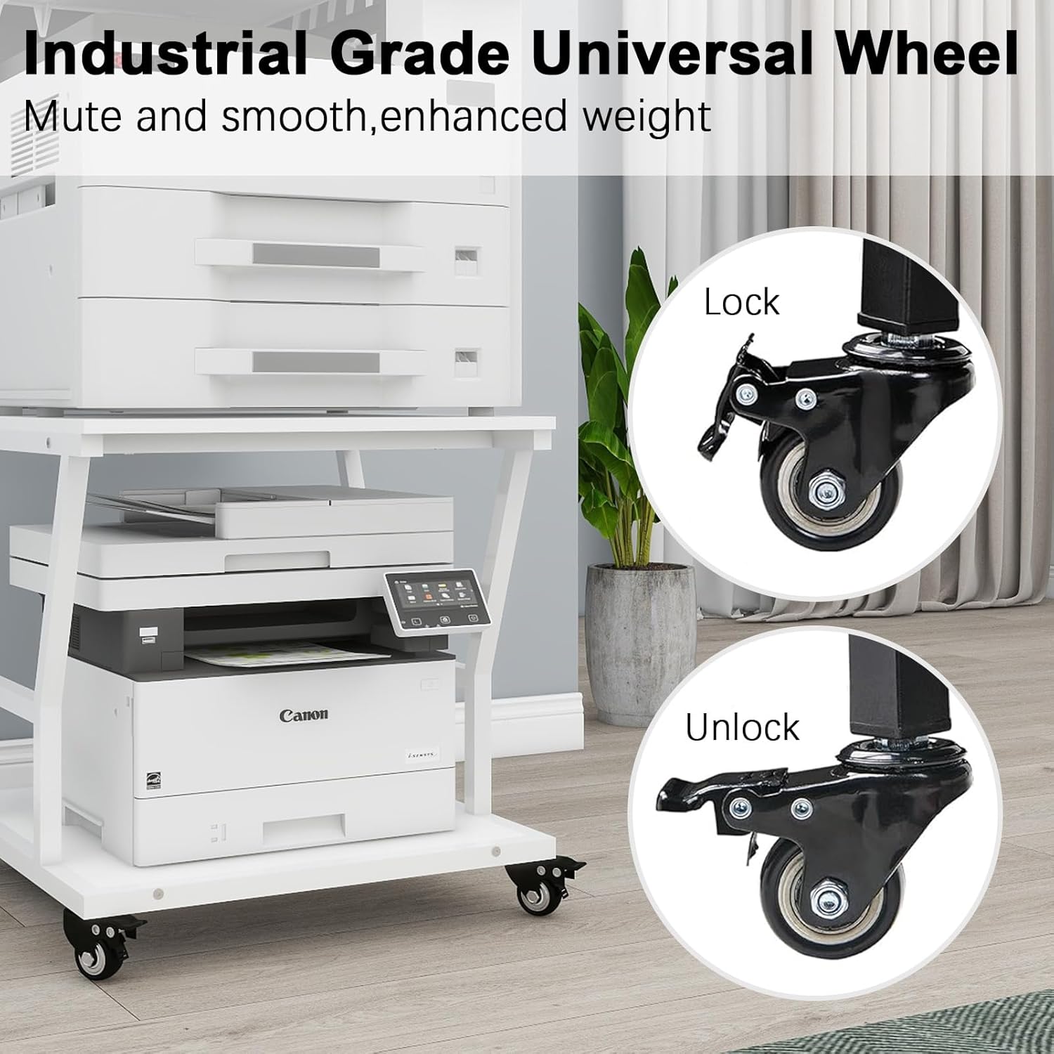 - 【With Industrial Grade Wheels】 The Printer Table is equipped with four lockable industrial grade wheels to support high load-bearing, it can rotate 360 degrees to move smoothly and quietly, also can be locked to keep in position and stability.