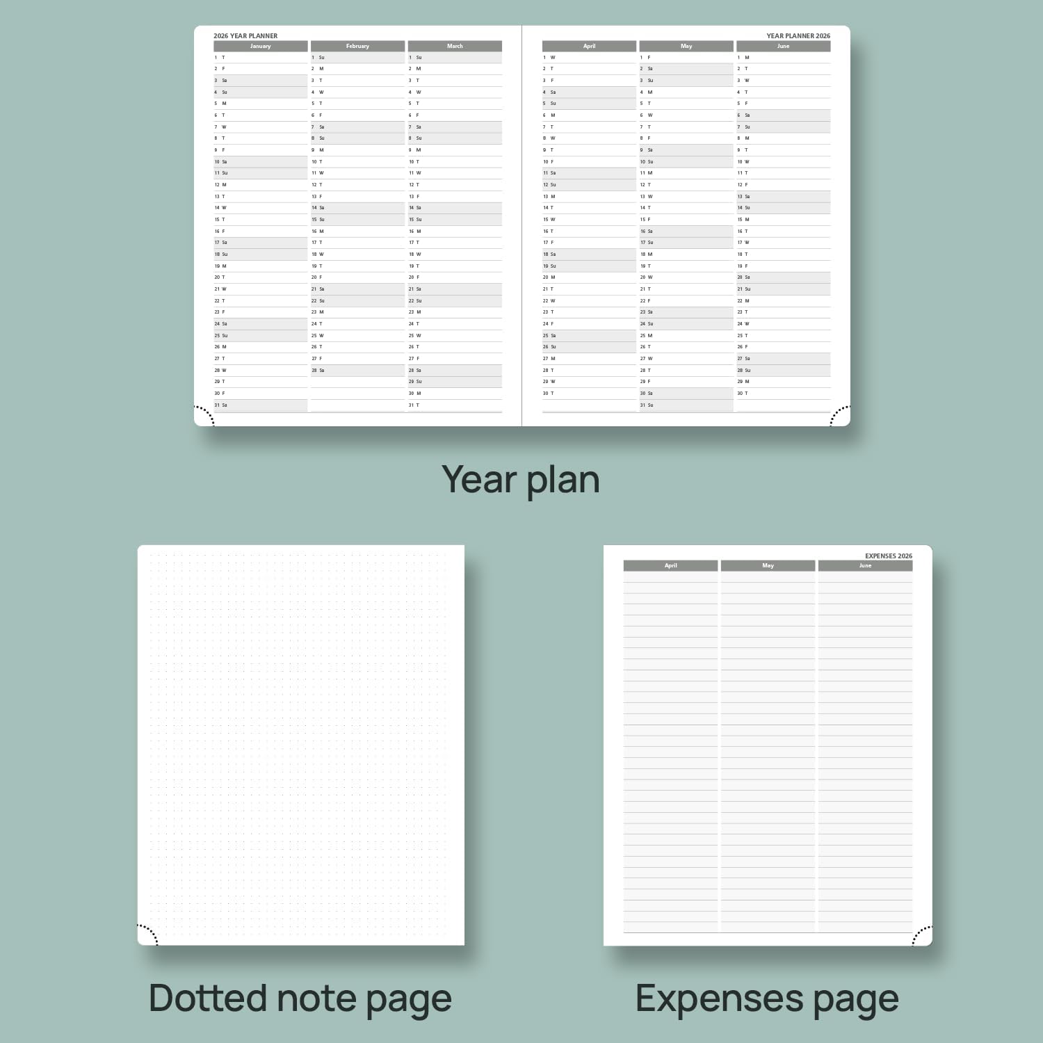 - EXTRA FUNCTION PAGES - Includes a 2025-2026 Yearly Overview, Holiday & Calendar, Monthly Expenses, Contact & Password pages, and 7 dotted notes pages for detailed jotting.