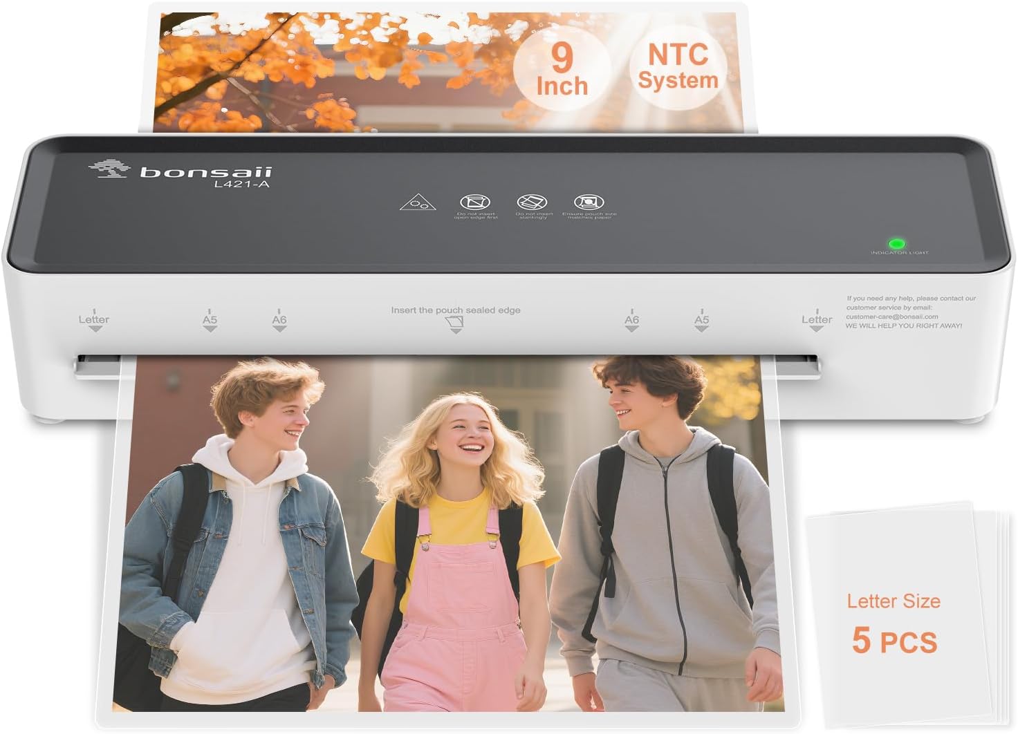 - 【Versatile & Compact Design】The Bonsaii 9-inch laminator comes with 5 laminating pouches for instant use. Its compact design (12.65"L x 3.74"W) ensures easy storage and portability, making it ideal for home, classroom, or office lamination tasks.