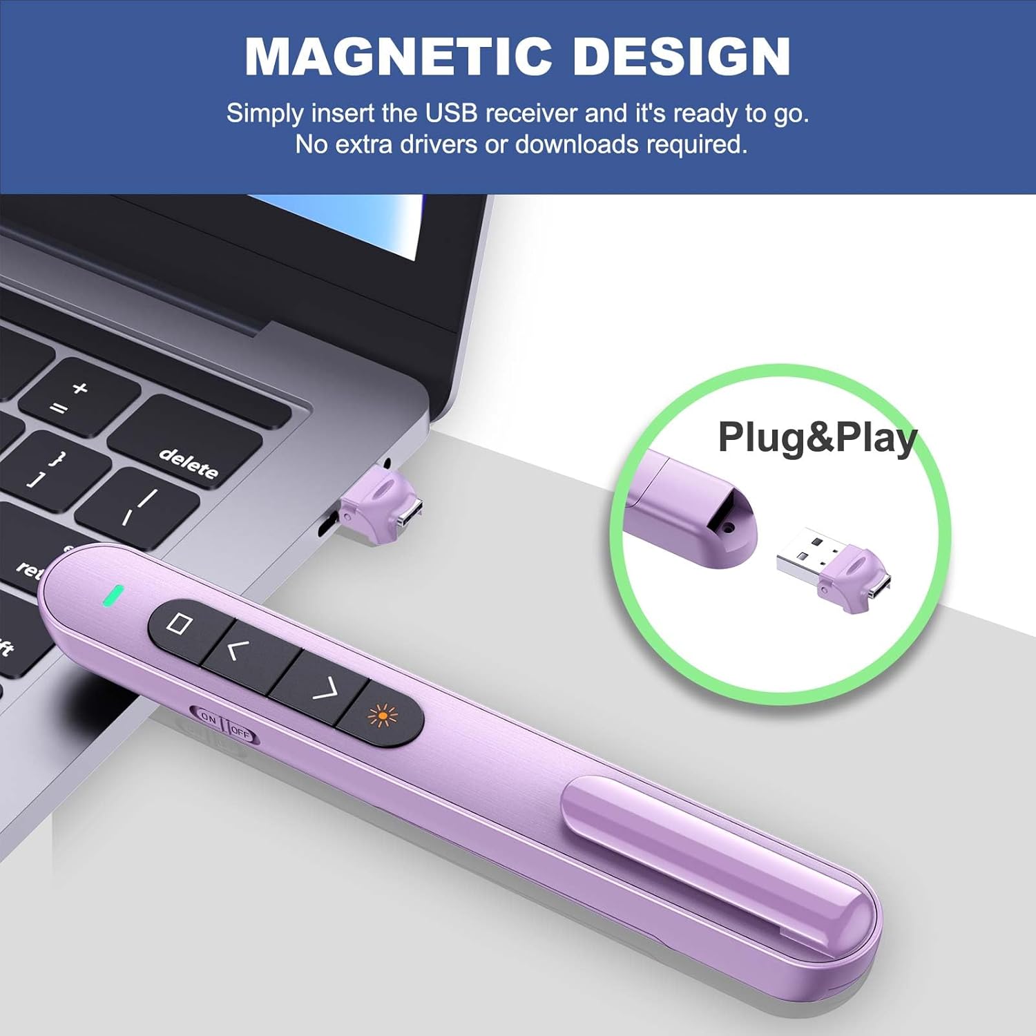 - 【PLUG & PLAY PRESENTATION CLICKER】The intuitive touch buttons of this presenter clicker integrate hyperlink navigation, page up/down, volume control, power switch, and full screen/black screen functions. No software is required, just connect the magnetic 2.4 GHz USB receiver at the bottom of the clicker to your computer and it's ready to use. (Powered by 1 AAA Battery is not included)