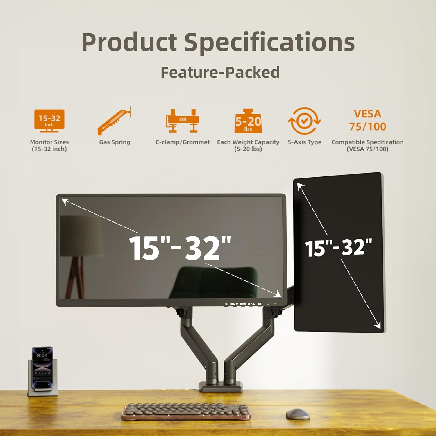 - Universal Compatibility: The Claiks Dual Monitor Arm is designed to fit most flat or curved LCD/LED screens ranging from 15" to 32", with a maximum load capacity of 40 lbs. It supports standard VESA mounting patterns of 75x75mm and 100x100mm, ensuring compatibility with a wide range of monitors.