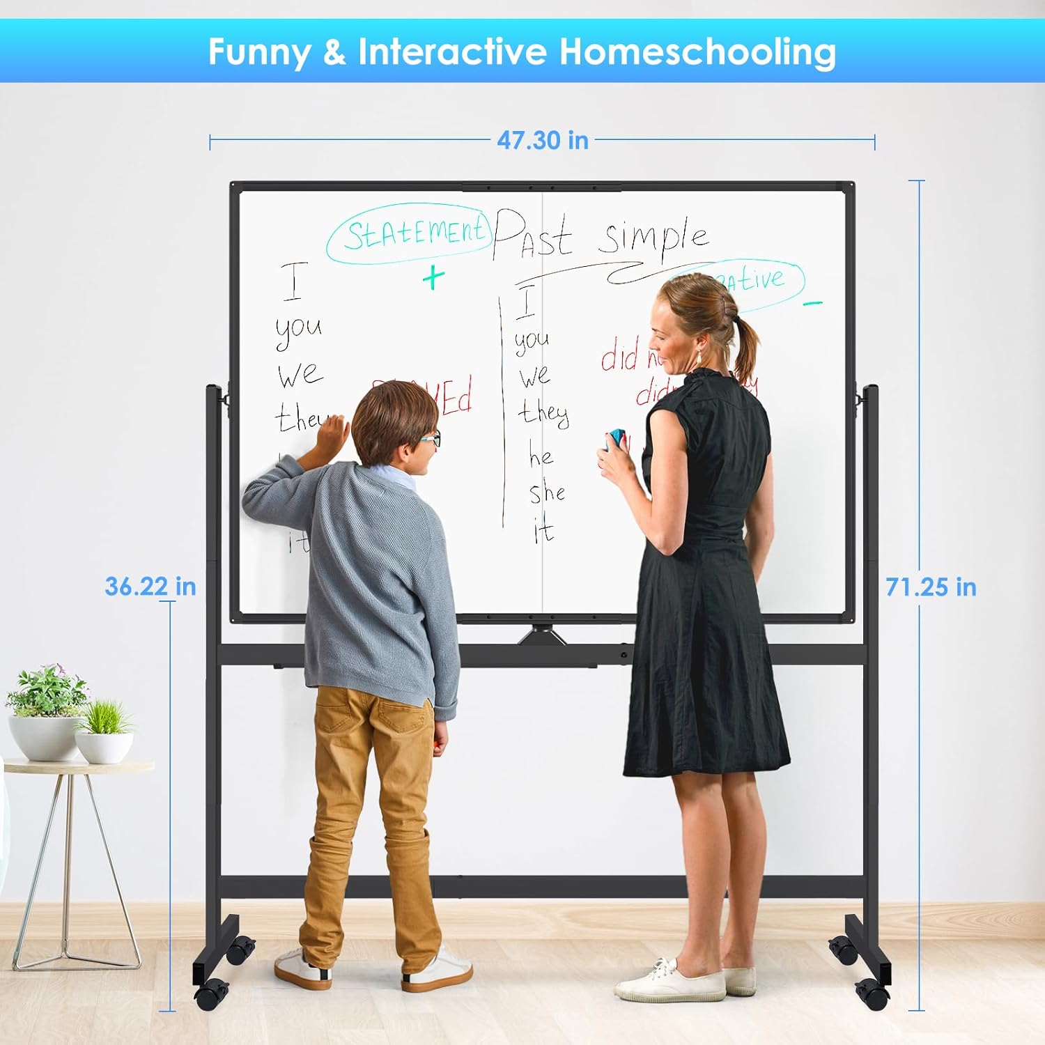 - Easy Rotation & Double Side: maxtek 48“x 36” double-sided white board with stands can easily flip to maximize writing space yet occupy less footprint. Due to its double side, different projects can be carried out simultaneously, like one for family plans and one for kids' painting. It also features magnetic surfaces and a pen tray, allowing accessories to be organized easily