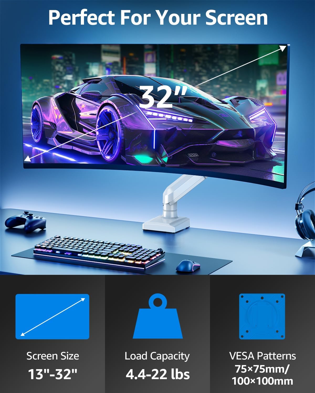Single Monitor Mount for 22 24 27 32 inch Screen, Gas Spring Arm Holds 4.4-22 lbs, Monitor Desk Mount, Gaming & Home Office Use, VESA 75x75mm & 100x100mm, Freelift Pro White