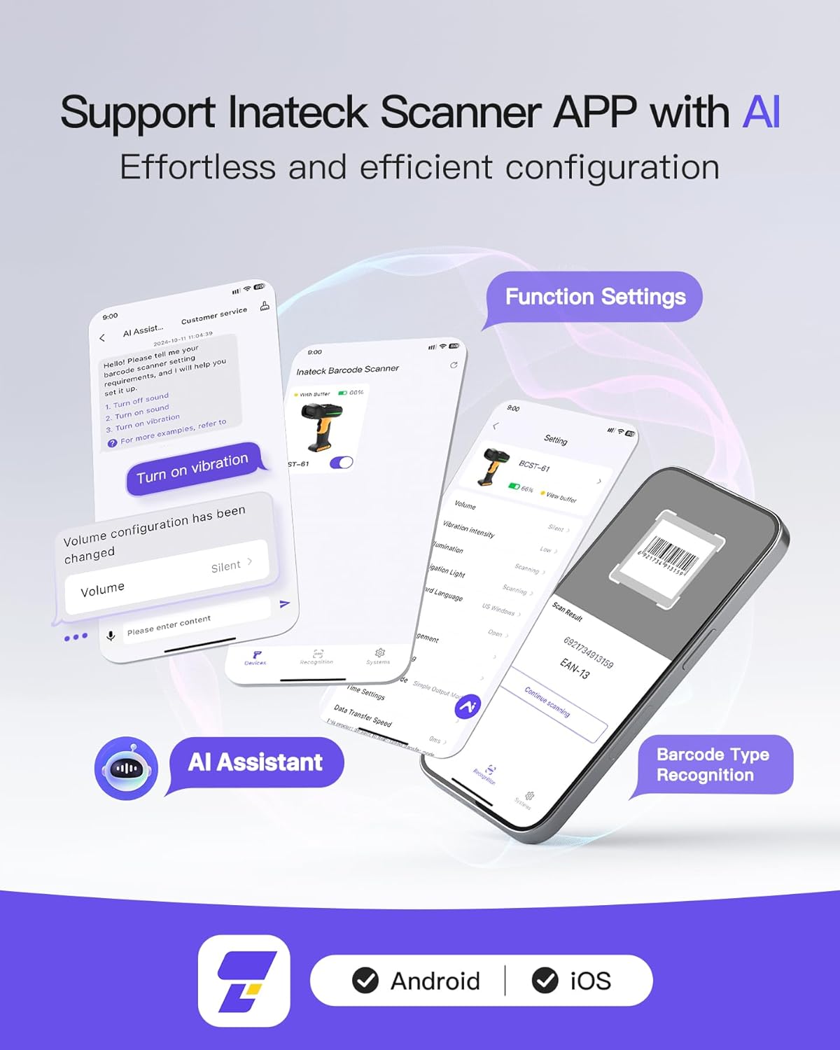 - AI Features: The Inateck APP is equipped with an AI chat function, allowing effortless setup of the barcode scanner and rapid data processing within seconds. Enjoy more customization options, faster operations, and greater simplicity. The SDK supports seamless integration with your system, greatly enhancing convenience