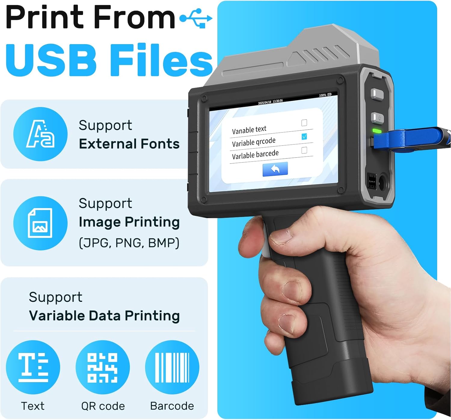 - Adjustable Print Height and Contents: This handheld printer offers adjustable print heights from 0.03 inches (0.8mm) to 1 inch (25.4mm), with the ability to print up to 10 lines of text. Capable of printing batch numbers, QR codes, UPC barcodes, dates, text, logos, pictures, and variable data on various surfaces.