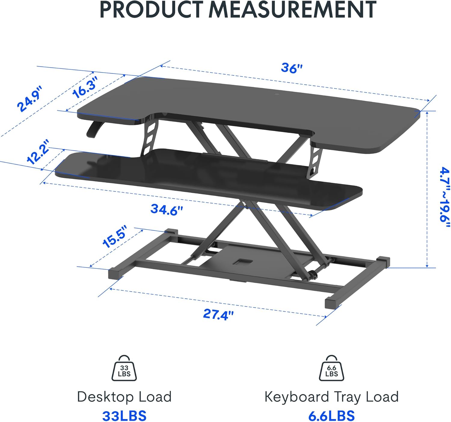 - Ergonomic 2-Tier Design: Our 2-tier design offers ergonomic excellence for reading and typing! The 35'' width of top tier holds a monitor up to 27'' with ease, the roomy base tier of 12.1'' depth holds a standard keyboard and mouse or a 13'' laptop