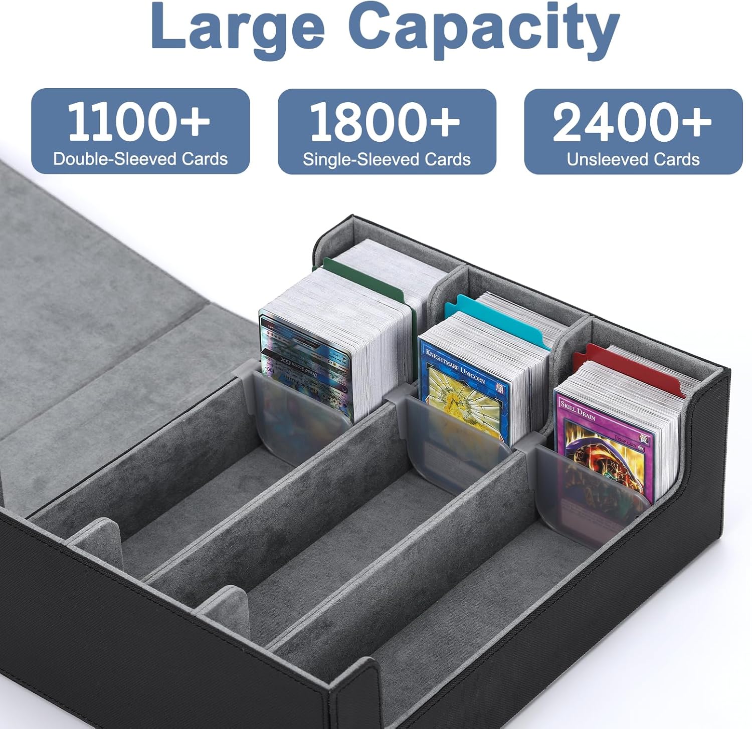 - 【Extra Large Capacity】The MTG card box holds 1800+ single-sleeved cards, 1100+ double-sleeved cards, 2400+ unsleeved cards. Please note: It is not suitable for hard plastic card protectors and magnetic card holders