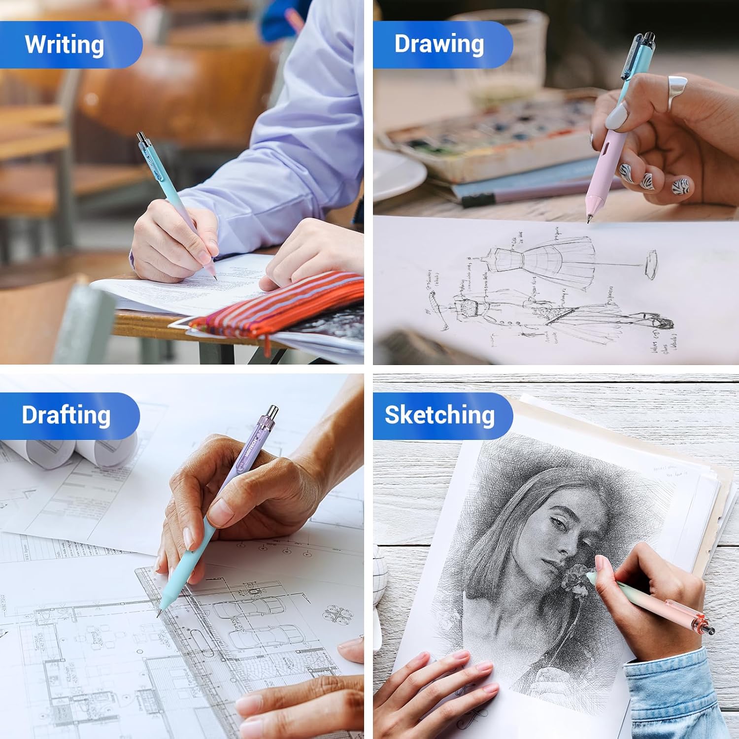 WRITECH Up Mechanical Pencil Set: 6ct Gradient Barrel 0.7mm Mechanical Pencils with 4 Tubes of HB Lead Refills and 2 Extra Erasers for Writing Drawing Sketching Drafting