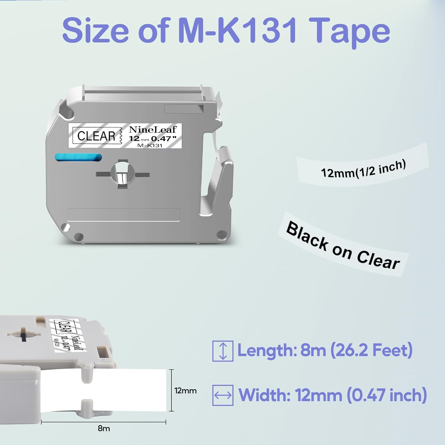 - NineLeaf Compatible for Brother P-touch MK131 M-K131 M131 M-K131S Non-Laminated Label Tape, Color:Black on Clear, Length:8m(26.2ft), Width:12mm(1/2")