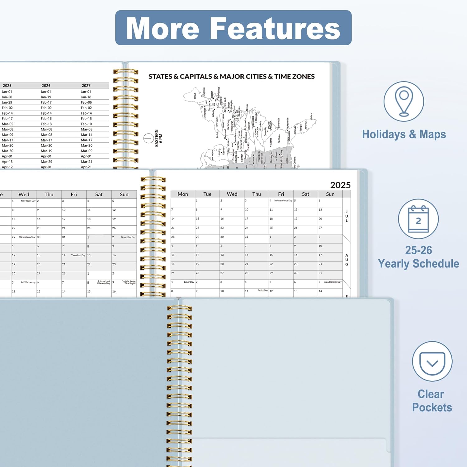 - Additional Features: The weekly planner includes 2025-2027 calendars, year schedule for academic year 2025, holiday lists, contact pages, notes pages, important dates, and US time zone map. Rainbow monthly tabs simplify navigation and add a stylish, playful element to the planner's aesthetic.