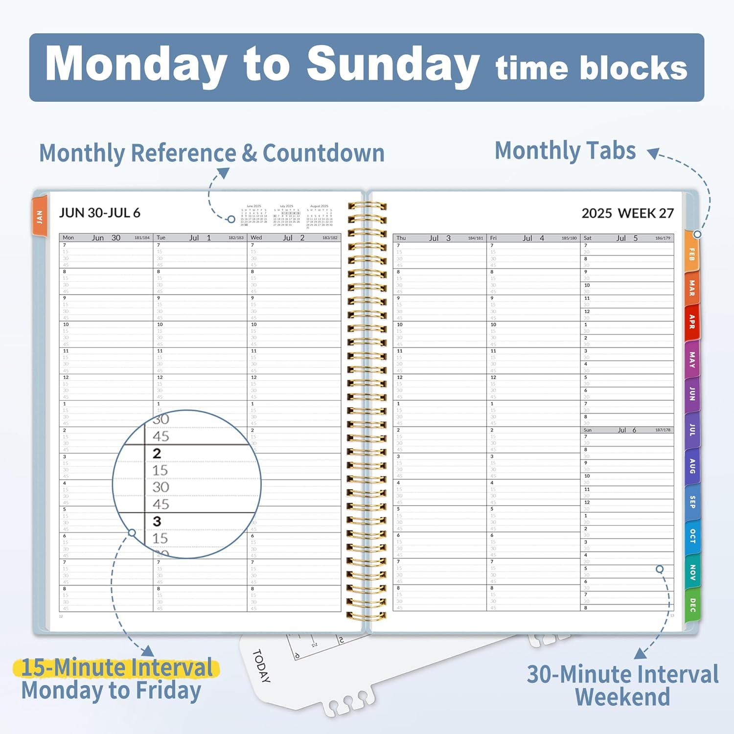 - Weekly View: 2-page weekly layout from Monday to Sunday, 15-minute time slots in increments from 7:00 a.m. to 8:45 p.m. on weekdays, and 7:00 a.m. to 8:30 p.m. on weekends, 3-month reference previews, allowing you to manage time and track appointments easily.