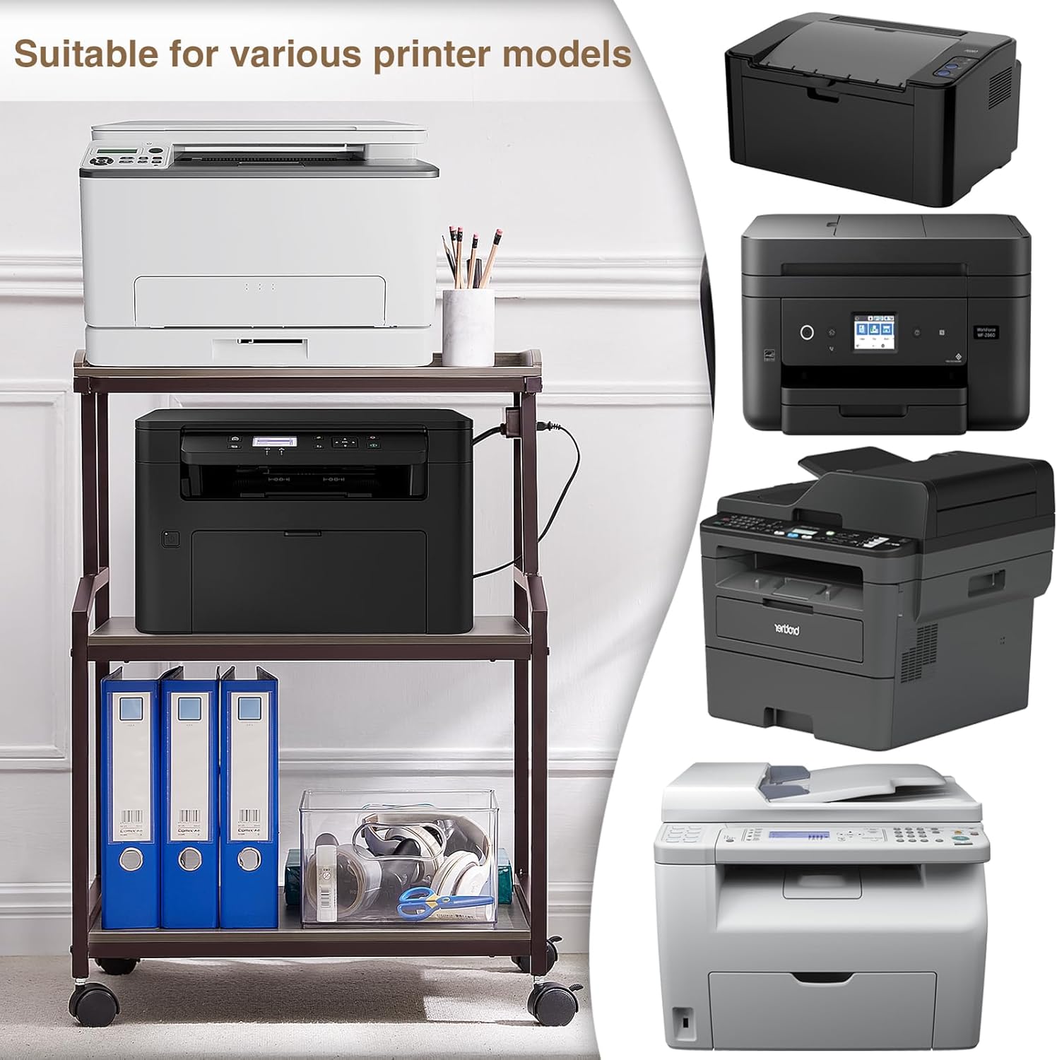 - Easy to Move & Stable When Stationary:The printer stand with storage has 4 wheels that can rotate 360°, and you can push the printer stand to wherever you want. 2 of the 4 wheels can be locked, allowing flexible movement while maintaining sufficient stability in the placement position of the printer stand