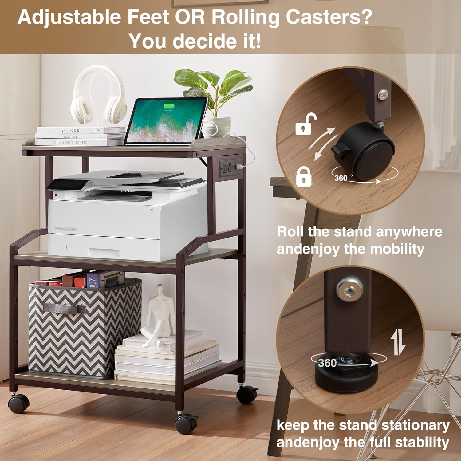 - Power Outlets and USB Charging Ports:The printer desk stand with storage built in 2 power outlets and 2 USB charging ports for your printer, paper shredder, scanner, phone, headset, tablet, and other office's electric equipment with fast charging flexibly at the same time. This is a real combination of stylish and functional. The 4.9ft power cord allows you to easily move the entire stand, making it easier for you to use the machine
