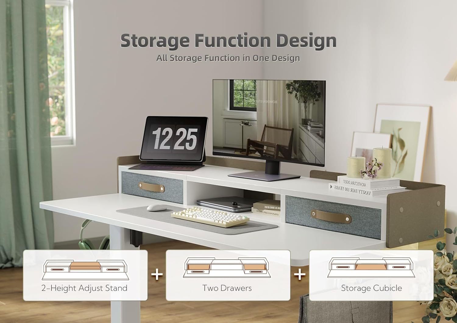 - 2-Drawers for Storage - Adjustable stand desk with drawers. 2 tabletop drawers provide more storage & organize space for a variety of home office tasks. The desk comes with a hook, drawers, and felt fence, which provides more home office desk usage possibilities.