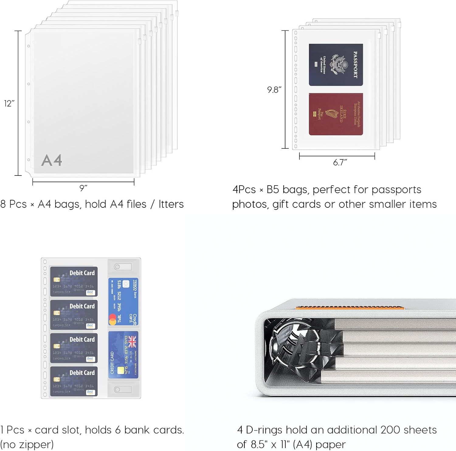 - Binder Pockets: The document holder includes 8 pcs A4 4-holes binder pockets, 4 pcs B5 binder pockets, 1 pcs card slot page holds 6 bank cards and USB