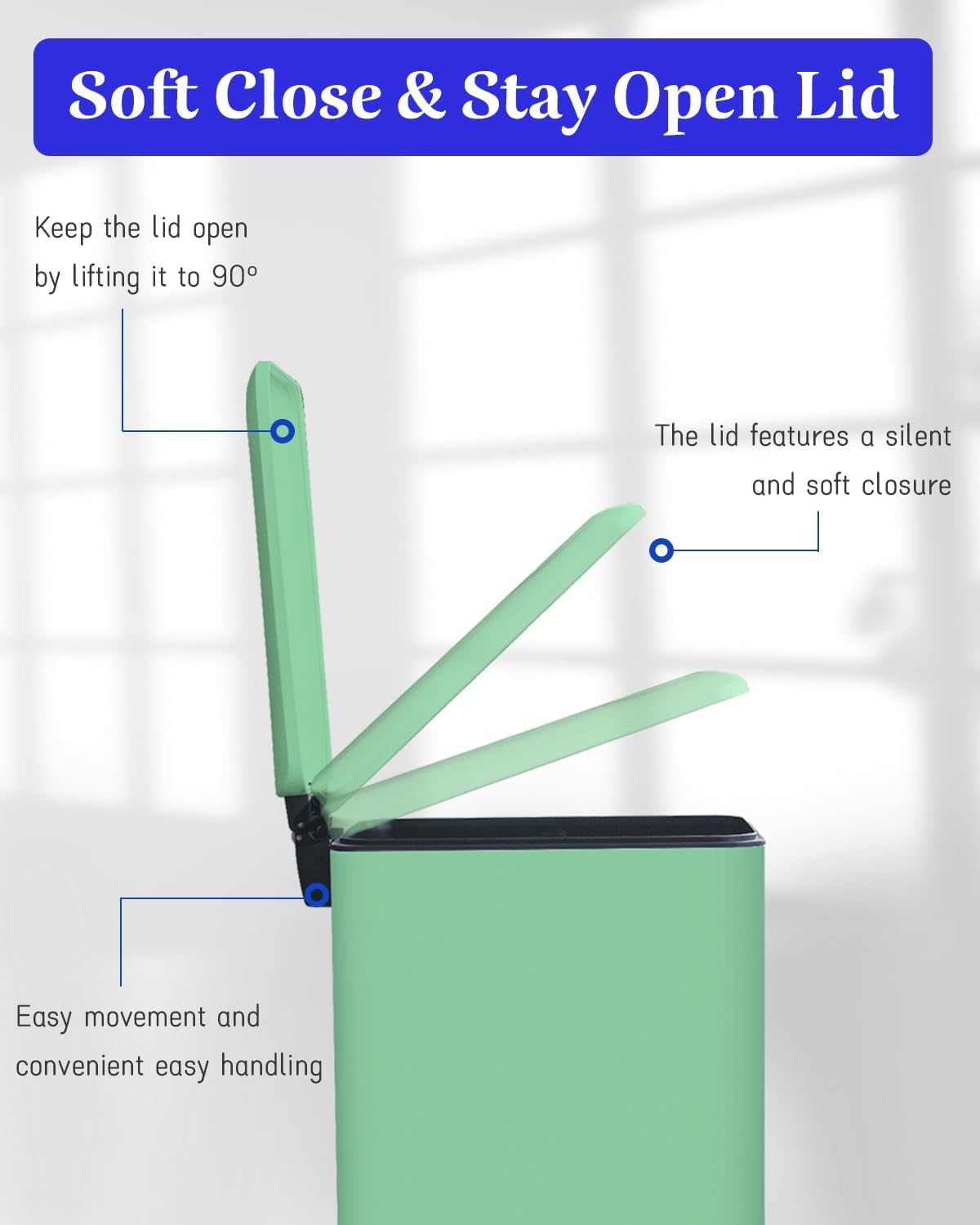 - Stylish Appearance Green cosmetic bin is made of stainless steel, which is fingerprint and rustproof. The waste basket is easy to clean and can be easily wiped clean with a damp cloth to restore the shine.