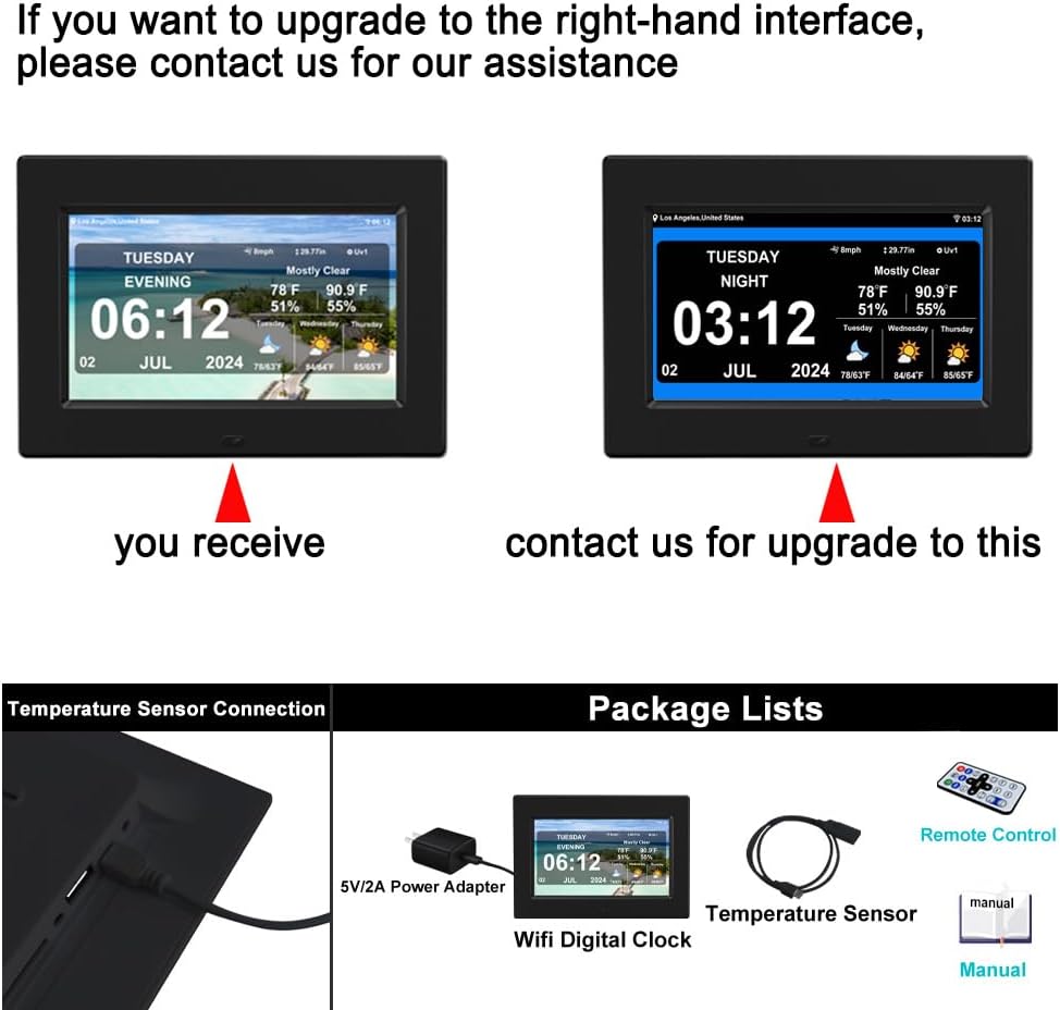 - 【12 Display Interfaces】: offers 12 different display interfaces, each highlighting different information to meet the needs of various users and scenarios. For example, weather clock interface mainly provides weather forecasts, temperature, humidity, and the time and date. The perpetual calendar interface displays the calendar and date in full screen. The elderly clock interface features extra-large fonts, with font colors adjustable to white, green, blue, or red to suit individual preferences