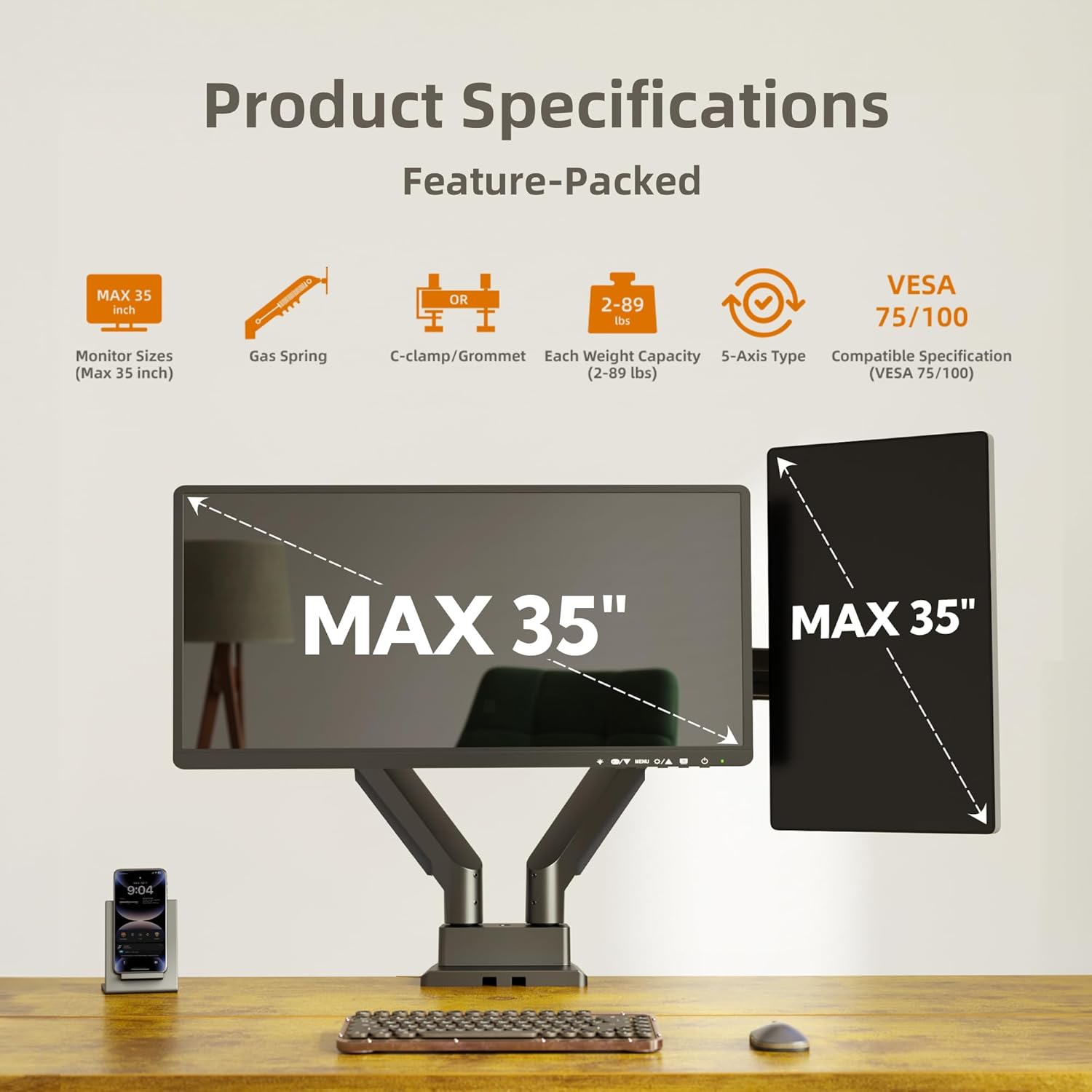Claiks Dual Monitor Mount for Max 35 inch Screens Stand up to Max 89 lbs, Ergonomic Gas Spring Heavy-Duty Adjustable Monitor Arm, with Clamp and Grommet Base, VESA Mounting Holes 75&100mm, Black