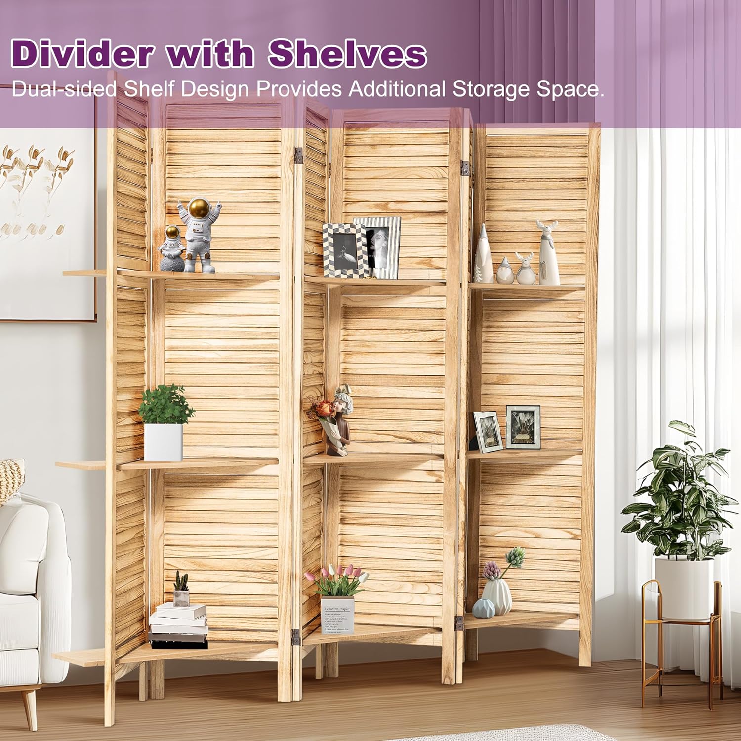 Room Divider with Shelves, 5.6FT Folding Room Divider Panel, 6 Panel Wood Partition Wall Divider for Room Separation, Natural Wood