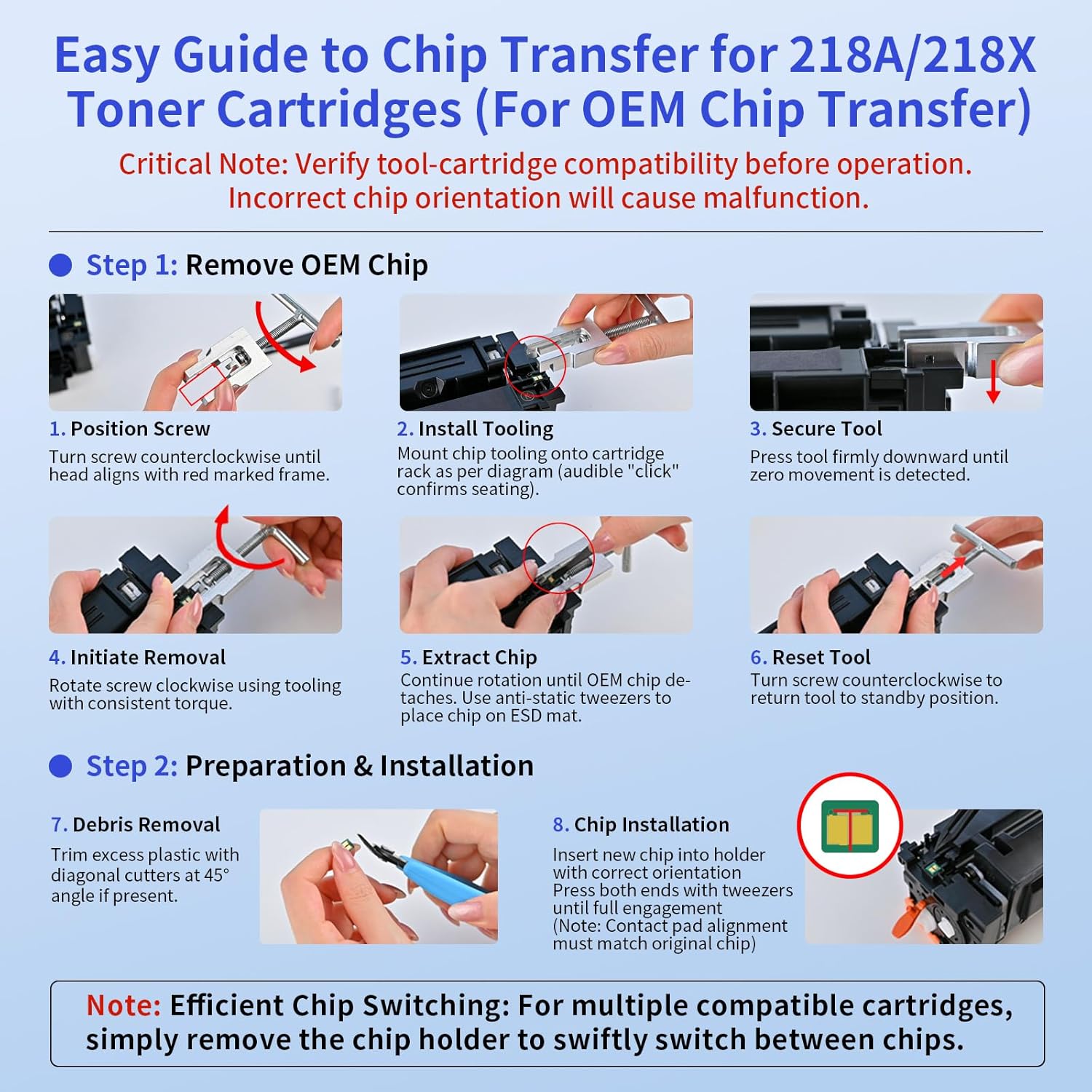 - No Chip: These 218A toner cartridges do not have chips. Remove the chip from the old toner cartridge and install it on the new 218A toner. Refer to the provided user guide for detailed instructions