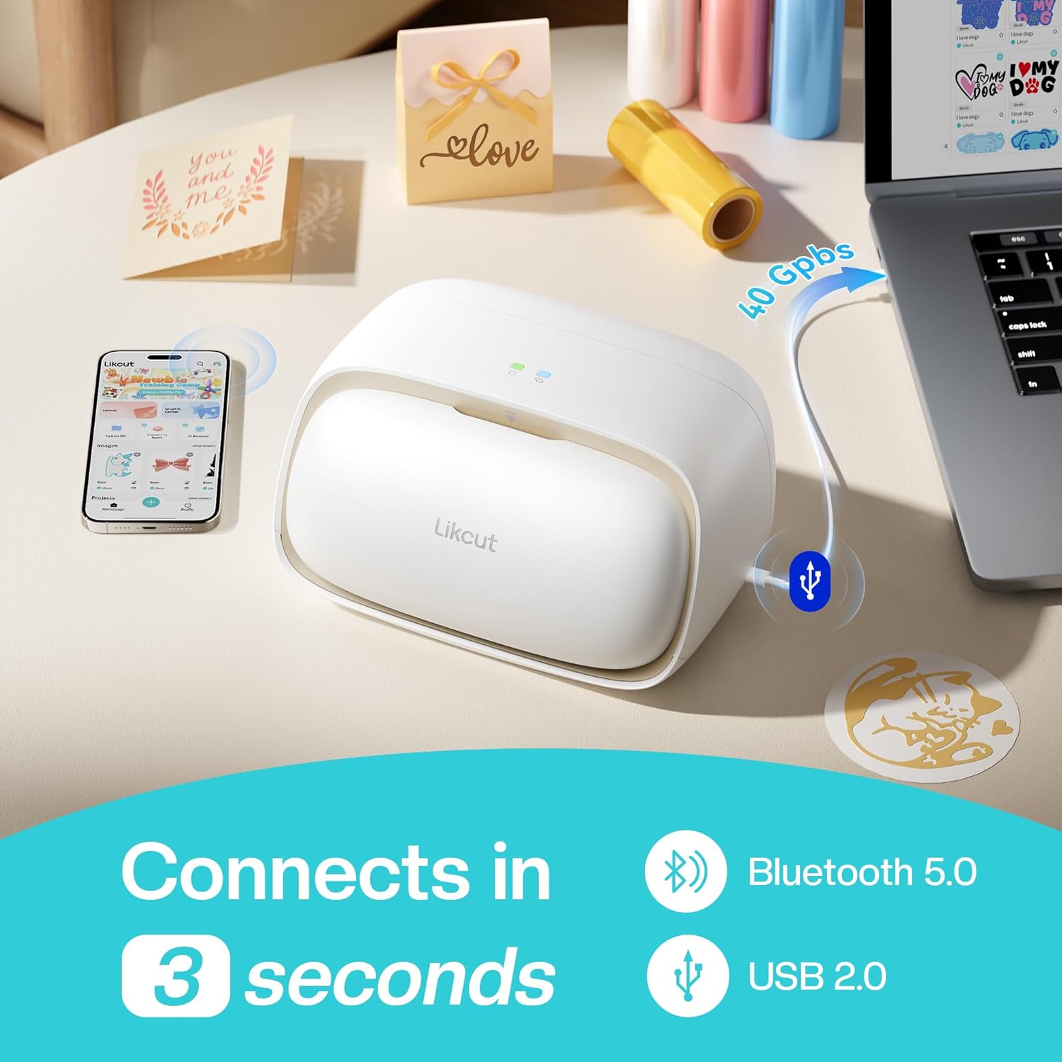 - Stable, Reliable Connectivity: With Bluetooth 5.0 and USB 2.0 options, Likcut smart cutter machine connect in just 3 seconds. Enjoy uninterrupted creativity without worrying about wireless interference or connection drops
