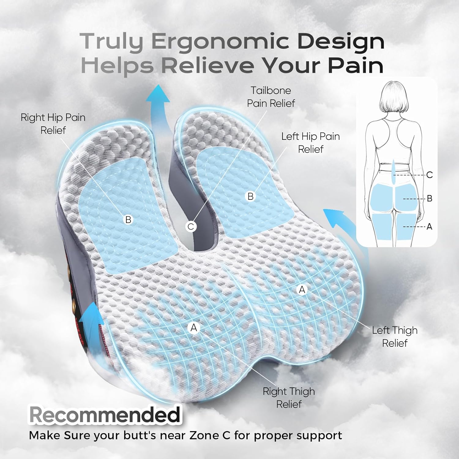 - ✔️ [Ergonomic U-Shape for Tailbone & Hip Pain Relief]---- Featuring an innovative tailbone cut-out for targeted pain relief, this design ensures even weight distribution to alleviate tailbone discomfort. The contoured hip zone and raised sides provide optimal hip support, helping to relieve sciatica, lower back pain, and hip pain.