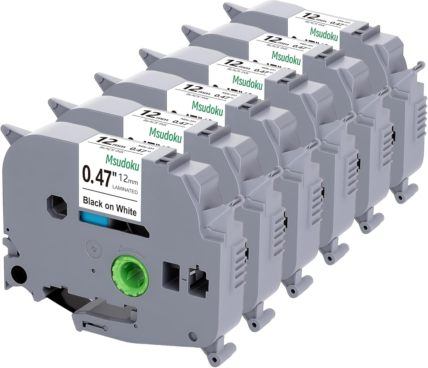 Tze TZ Tape 12mm 0.47 Laminated White Tape Compatible for Brother Label Maker Tape 12mm 1/2" Black on White Tape for Ptouch PT PTD200 PTD410 D210 D220 D610 P710BT PTH110, 6-Pack