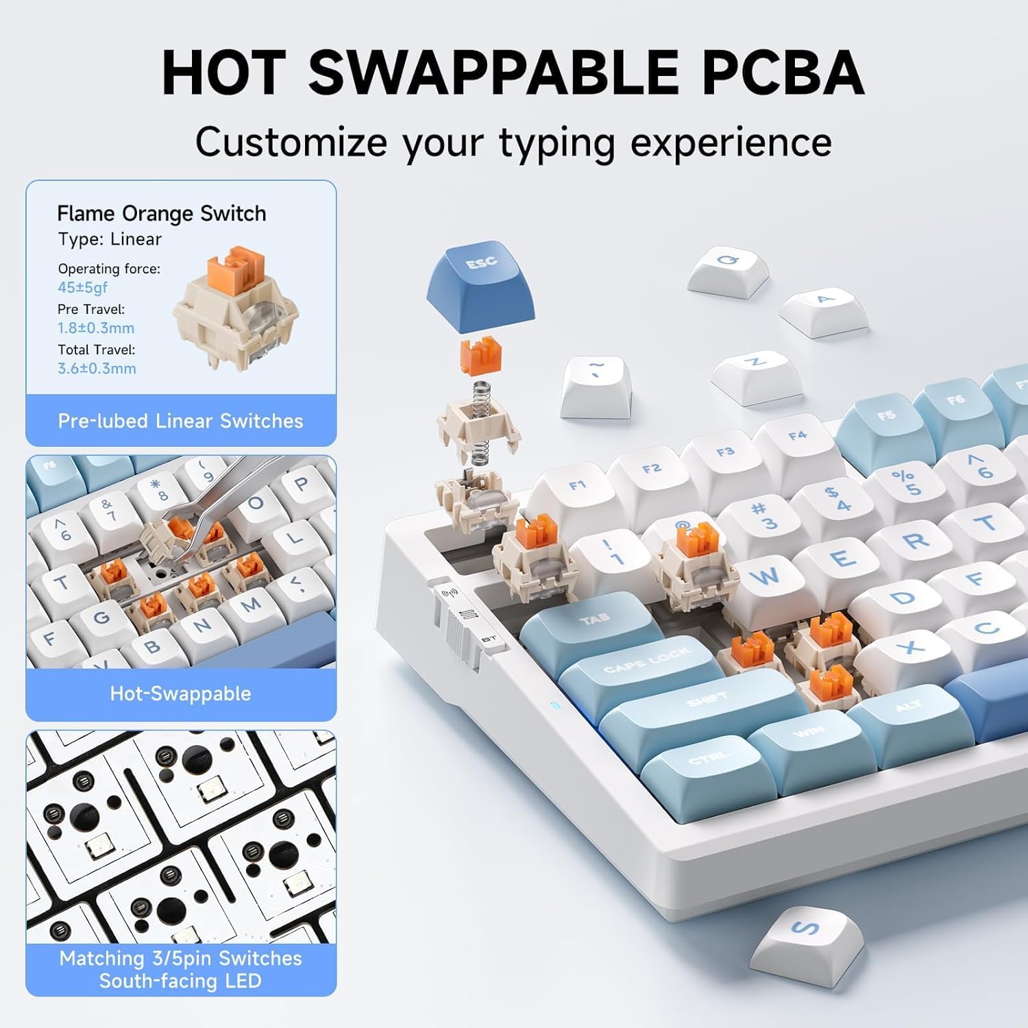 G98 PRO Wireless Gaming Keyboard, Tri-Mode Connection Mechanical Keyboard, Hot Swappable Custom Gasket Structure, Pre-lubed Linear Switches, Double Shot PBT Keycaps, RGB LED Backlit, Blue&White