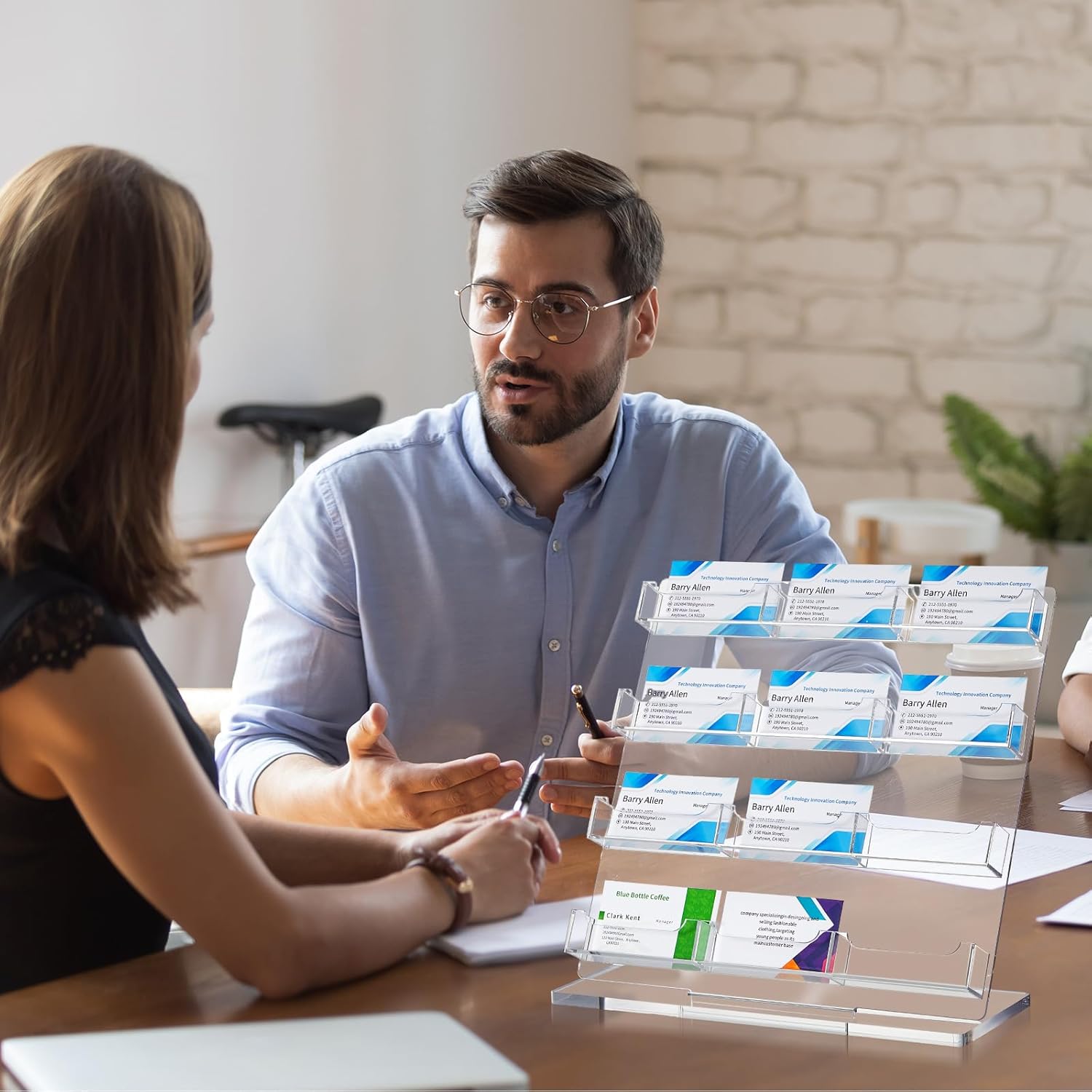 - Intuitive Structure: our business card holder for desks features 4 tiered and 12 slot design, which helps in maximizing space utilization; The slanted angle offers easy display of your business cards, ensuring that they remain unobstructed and easily accessible; This convenient design satisfies your immediate business card needs, allowing you to focus on your core tasks