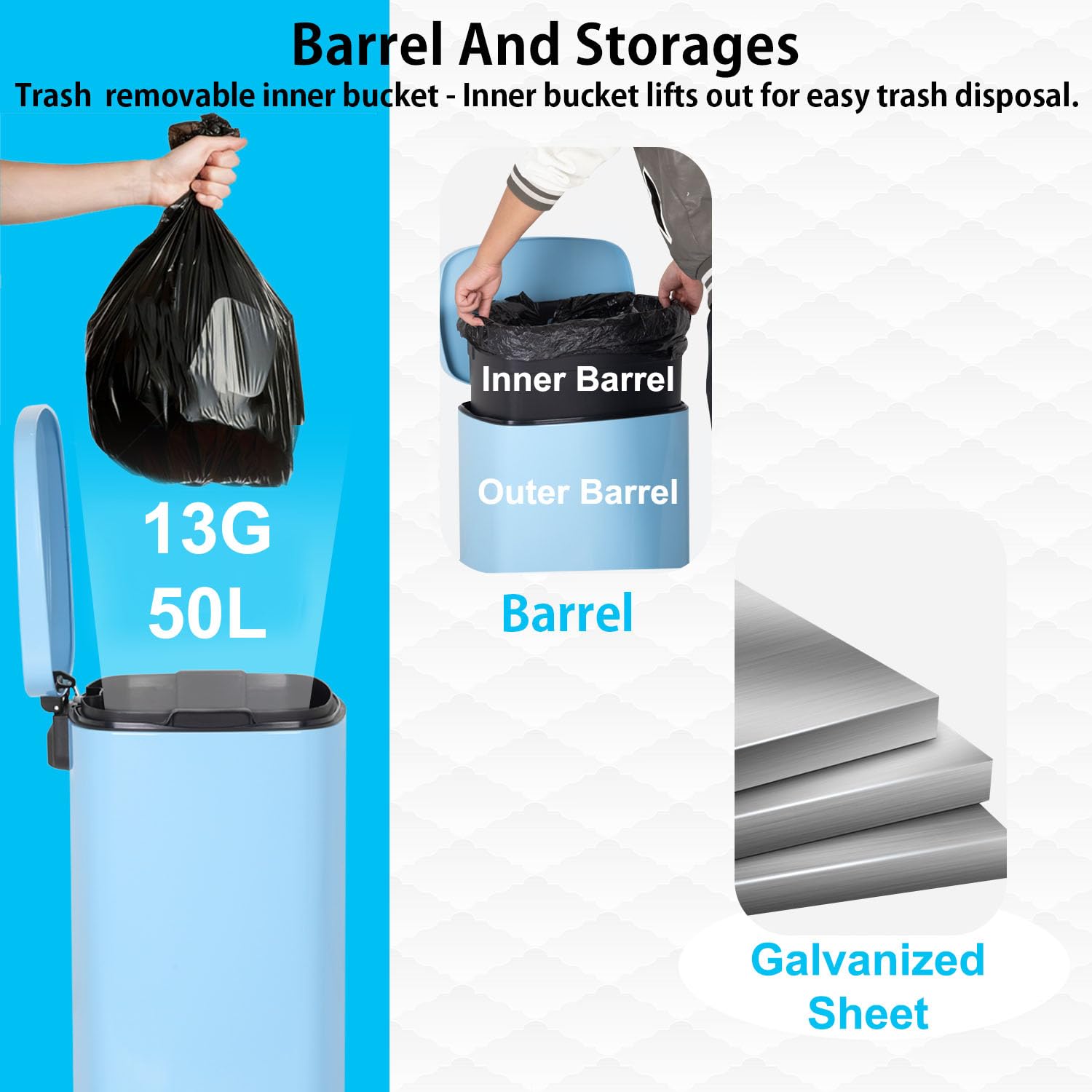 - 13 Gallon Ultra-large Capacity: 13 gallons can absolutely meet your daily use, in the kitchen table next to a kitchen trash can, you will be more convenient to deal with kitchen waste. The regular 13-gallon garbage bag in the supermarket can be used in our stainless steel trash can, and it's kind of you to use a bigger bag. The lid of the garbage can is removable, it’s convenient for you to put in and take out the garbage bag.step trash can kitchen trash can bedroom trash can