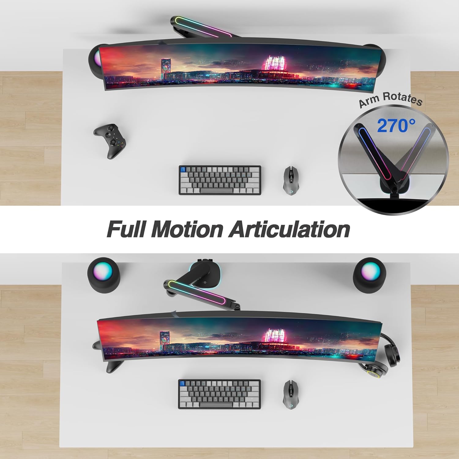 AVLT Single 27”-45” RGB Gaming Monitor Arm Desk Mount Built-in 20 Lighting Modes Touch Button Control Fits Flat/Curved/Ultrawide Screen Height Swivel Tilt Rotation Adjustable Stand -Black