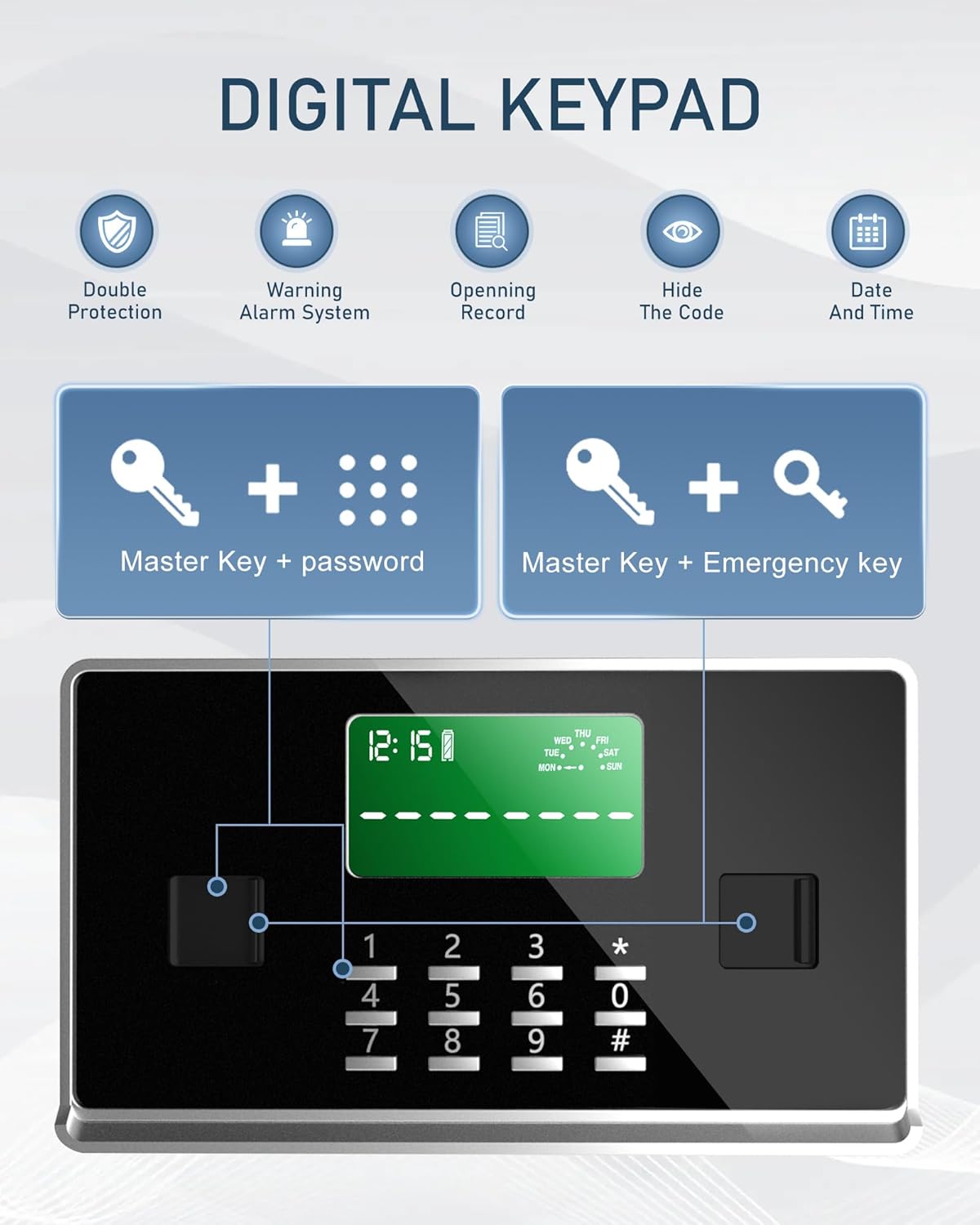 - γAnti-Theft Alarm System & Hidden Codeγ: Our large home safe has anti-theft alarm systems.Violent vibration or Three- incorrect entries can activate the alarm system by sounding for 60 seconds. Security Safe can keep max 35 opening records and allows you to program your code with 1-8 digits; Dial β*β before entering the code can active the secure display feature (the code you enter will not be shown on the screen)