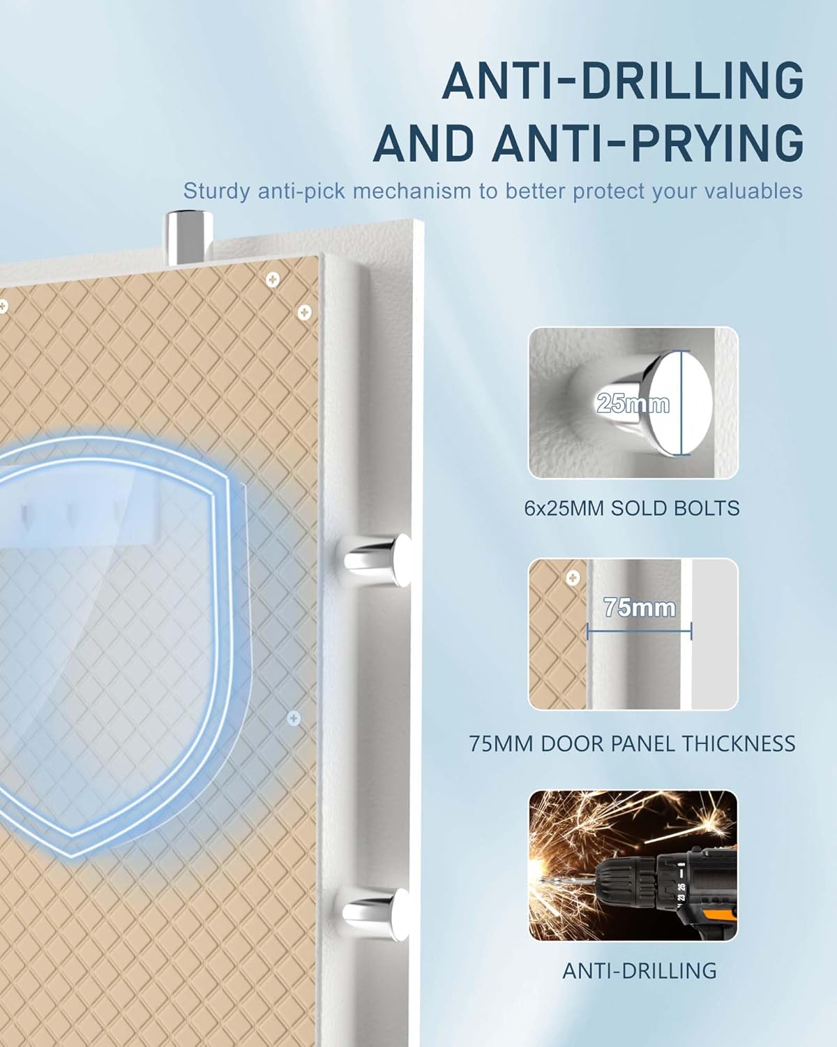 - γExtra Large Security Safe BoxγοΌOur extra-large security safe weighs 108 pounds, so it's hard for anyone to steal it. It features a 75mm extra-thick explosion-proof steel door, 6*25mm high-strength solid locking bolts and pry-resistant concealed hinges, guaranteeing top-notch security for your valuables. For added protection, the safe can be anchored to the wall using expansion screws.