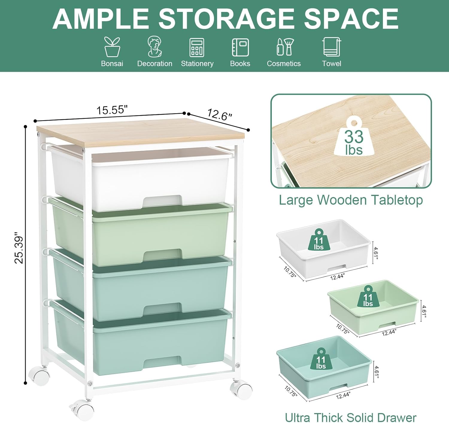 Utility Cart with 4 Drawers,Rolling Storage Cart with Drawers,Storage Rolling Drawer Cart with Wooden Tabletop for Bedroom,Kid's Room,Dorm,Classroom,Office,Green