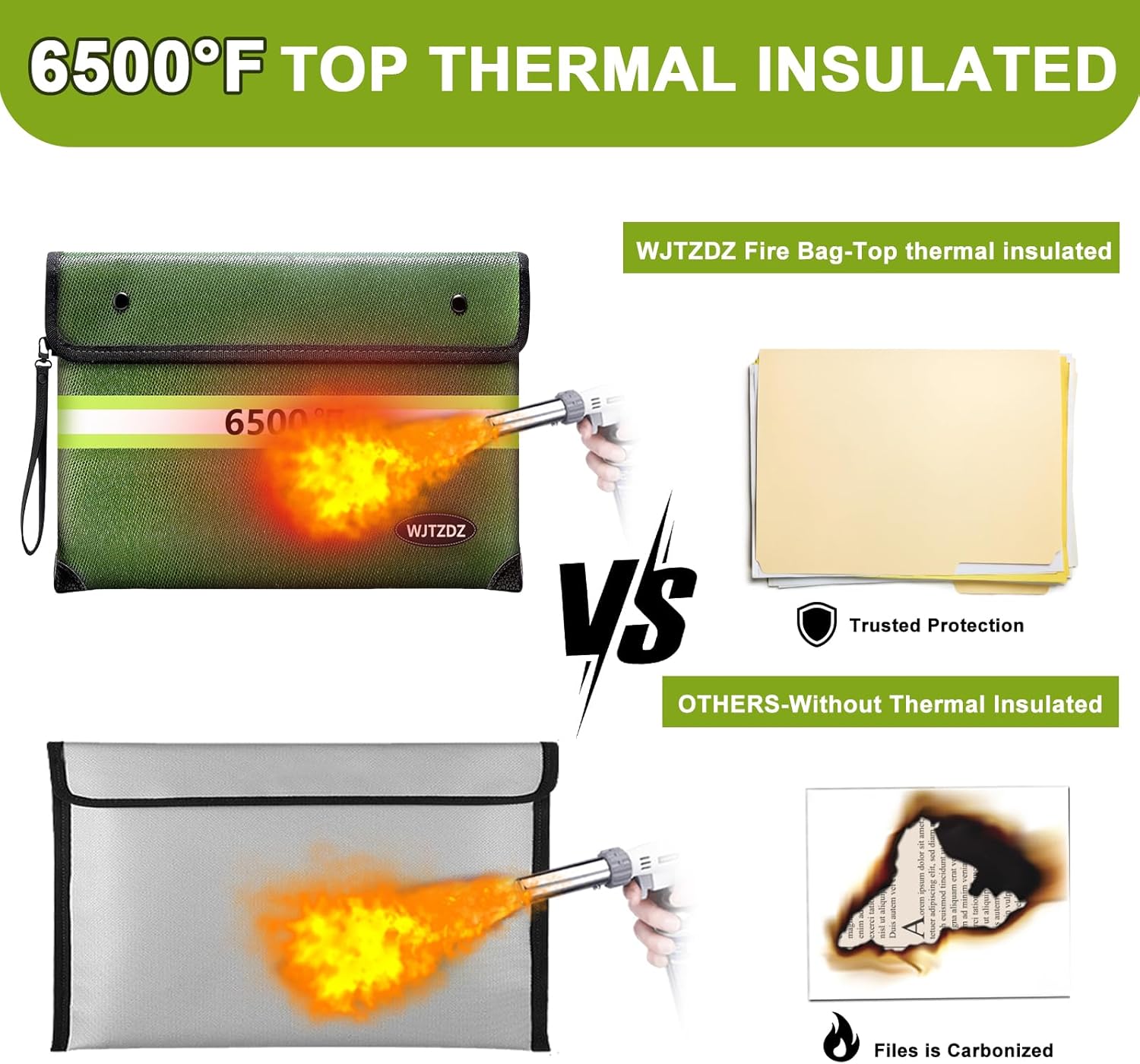 - ⚠️(Note) Fireproof does not mean it can withstand a long fire, and waterproof does not mean it can be immersed in water for a long time.It just gives you enough time to rescue your valuables. 🔥【6500°F Top Fireproof】The upgraded fireproof bag has passed the global flammability standard (US laboratory) and vertical burning test (SGS UL94 V-1) and can withstand temperatures up to 6500°F, far exceeding the typical fire temperature.