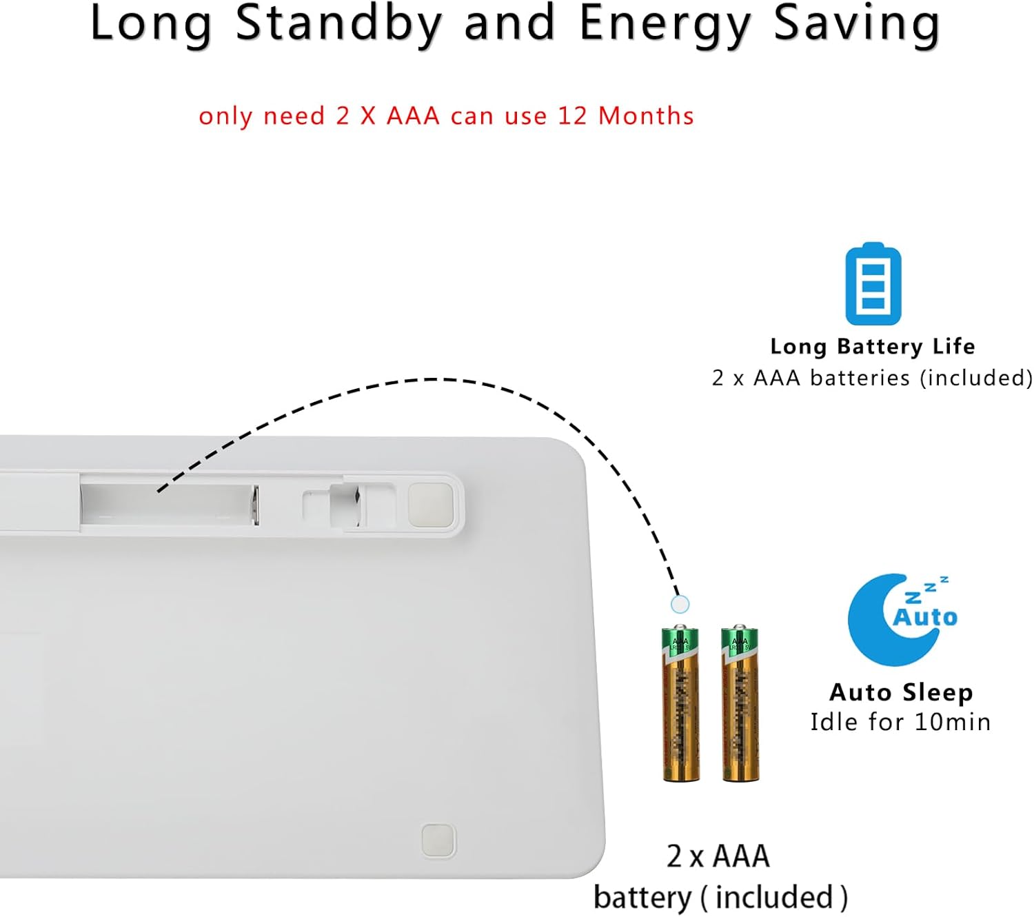 - Long-Lasting Battery: the bluetooth wireless keyboard powered by 2 AAA batteries (included), the keyboard intelligently enters sleep mode after 10 minutes of inactivity. The auto-sleep technology, on/off button(on the back of the keyboard) and the battery indicator light help to save more power,Simply click any key to wake it up in seconds.