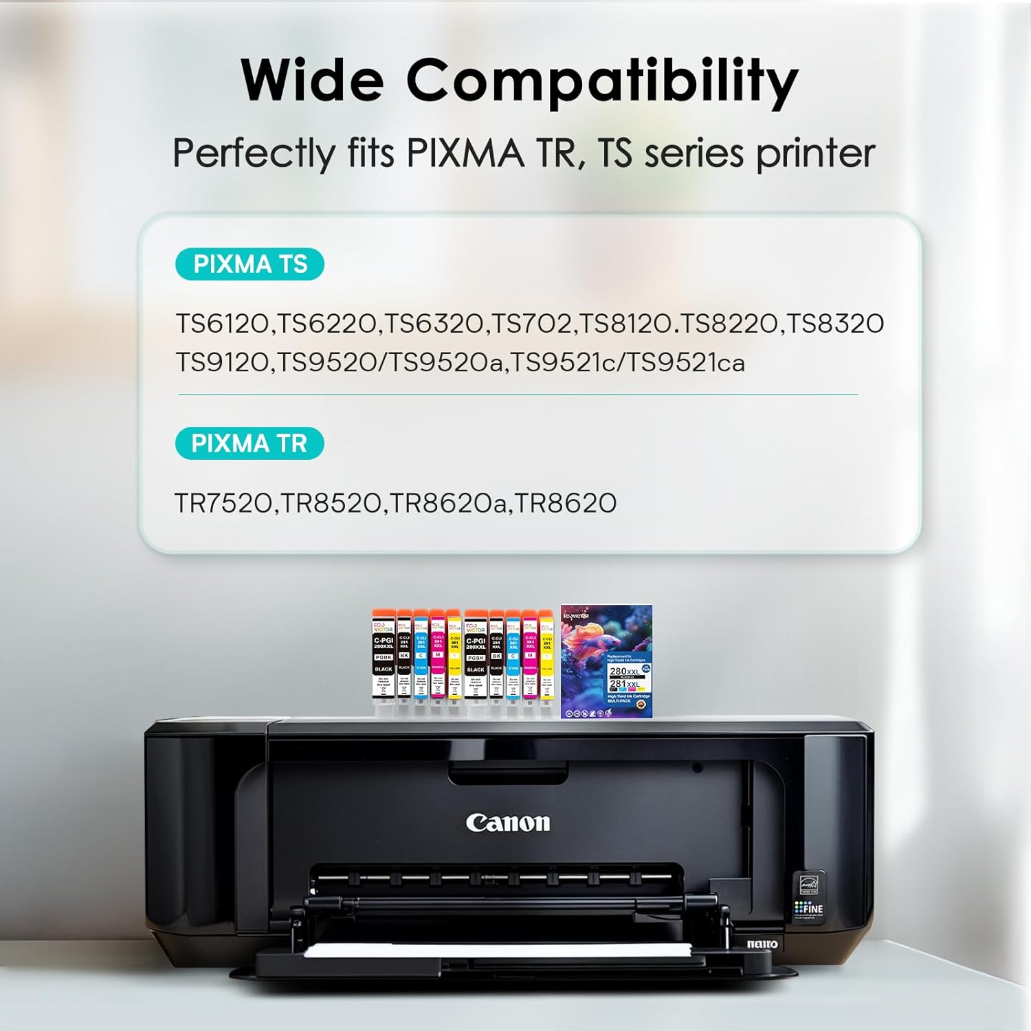 - 280XXL 281XXL Ink Cartridges for Canon Printers List: 280 281 ink cartridge Compatible with canon pixma TR8620a TR8620 TR8520 TR8500 TR7520 TR7500 TS6100 TS6120 TS6200 TS6220 TS6300 TS6320 TS702 TS8120 TS8100 TS8220 TS8200 TS8320 TS8300 TS9120 TS9100 TS9520 TS9520a TS9521c TS9521ca (please confirm your printer).