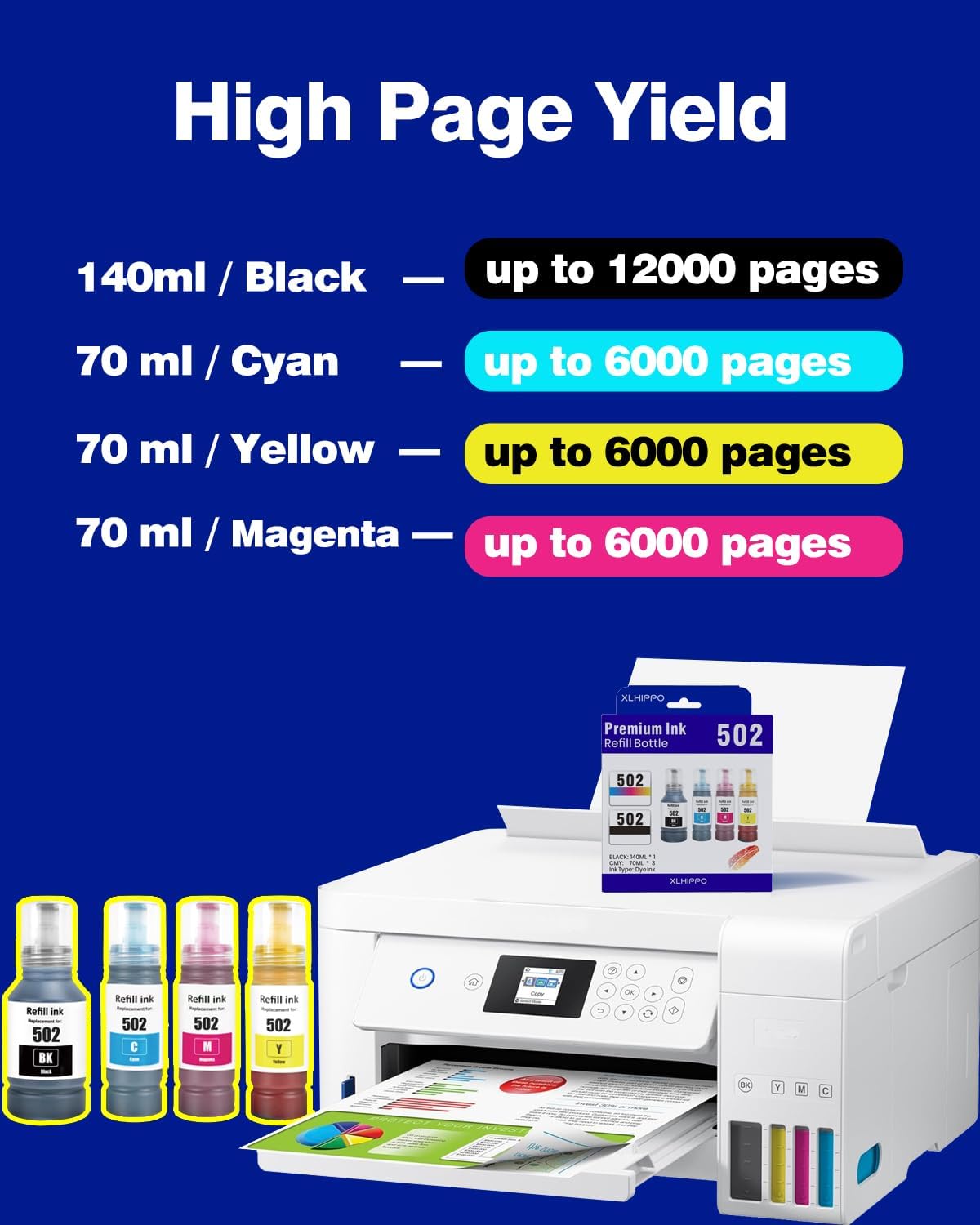 - High Capacity Ink 502 -- 2850 ink, 3850 ink, 15000 ink, 4850 ink, 4760 ink, 2760 ink, 3830 ink, 3843 ink, 2750 ink, 4750 ink, 3700 ink, 3750 ink, long-lasting and long-lasting support, 502 black ink can print more than 10,000 pages, 502 color ink can print more than 8,000 pages.