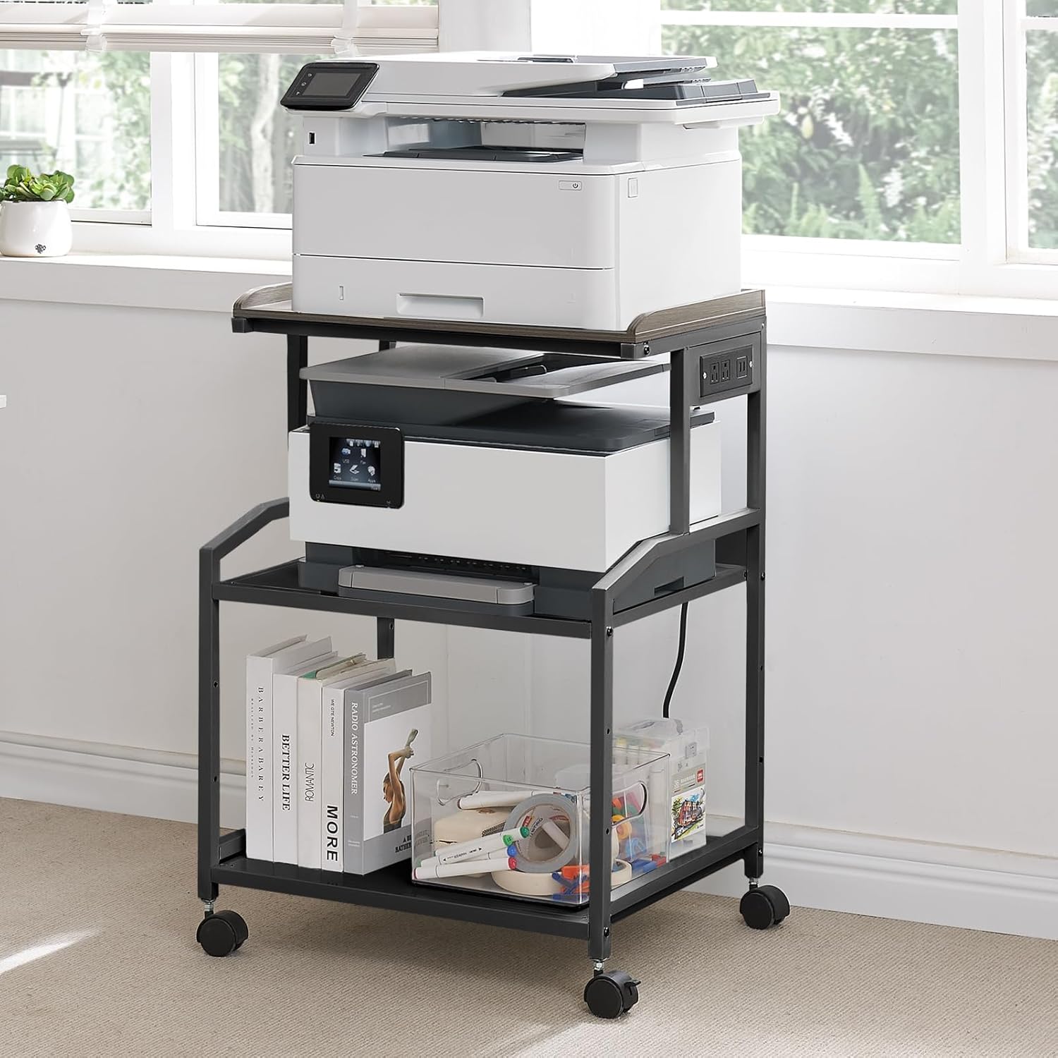 Lauren&Harold 34'' Printer Stand with Power Outlets & USB Ports, 3-Tier Adjustable Rolling Cart, Heavy Duty 150LBS Storage Table with Wheels for Office, Kitchen, Living Room, Black