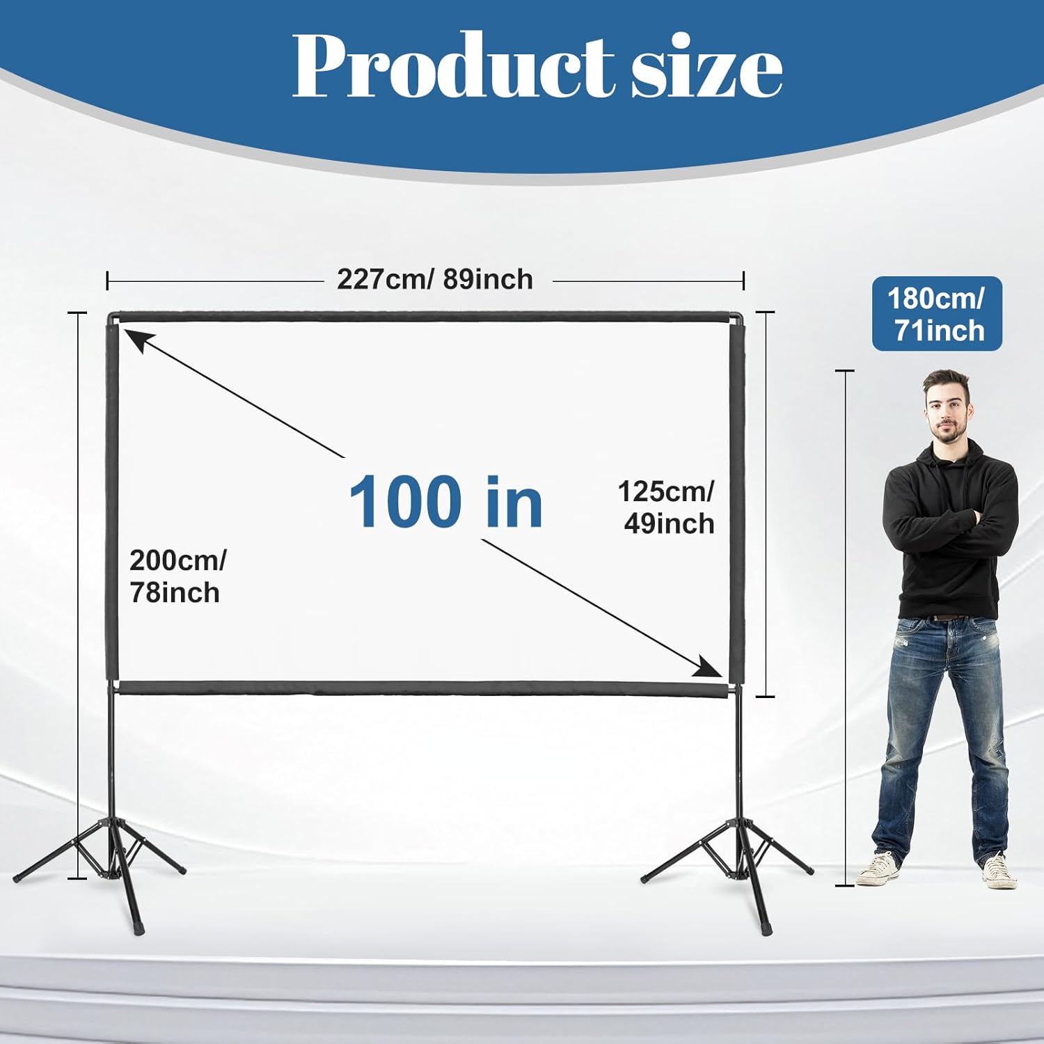 - 【Portable & Storage】 Equipped with a portable bag, the entire projector screen with stand can be easily placed inside. It is lightweight and convenient, making it perfect for carrying around. Moreover, it takes up little space and is also ideal for storage. Its portability makes it an ideal choice for various indoor and outdoor activities, such as camping trips, home theaters, backyard movie nights, party decorations, schools, offices, weddings, education, conference room presentations, public displays, churches, etc.