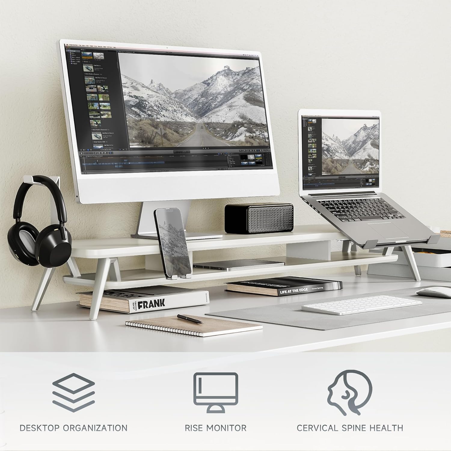 - 【2 Tier Desktop Organizer】At longest 42.5inch wide, longer size with more space to support two monitors. It has a Laptop Riser, a Tablet Phone Holder, and a Headphone Holder. You can easily store your accessories on your monitor stand to keep your desktop tidy. Monitor riser with 5.5 inches height of the desk stands, avoiding cervical spine problems caused by long-term bow in the process of working.