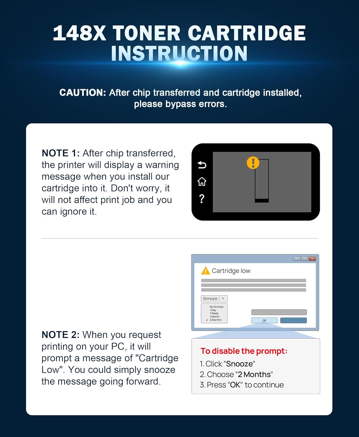 - ❗❗❗NO CHIP: This HP148X W1480X toner cartridge DOES NOT HAVE CHIP . Before choosing us,please make sure you have the original OEM 148A or 148X toner.Then follow the instructions to remove its chip from original OEM toner and install it to our product.