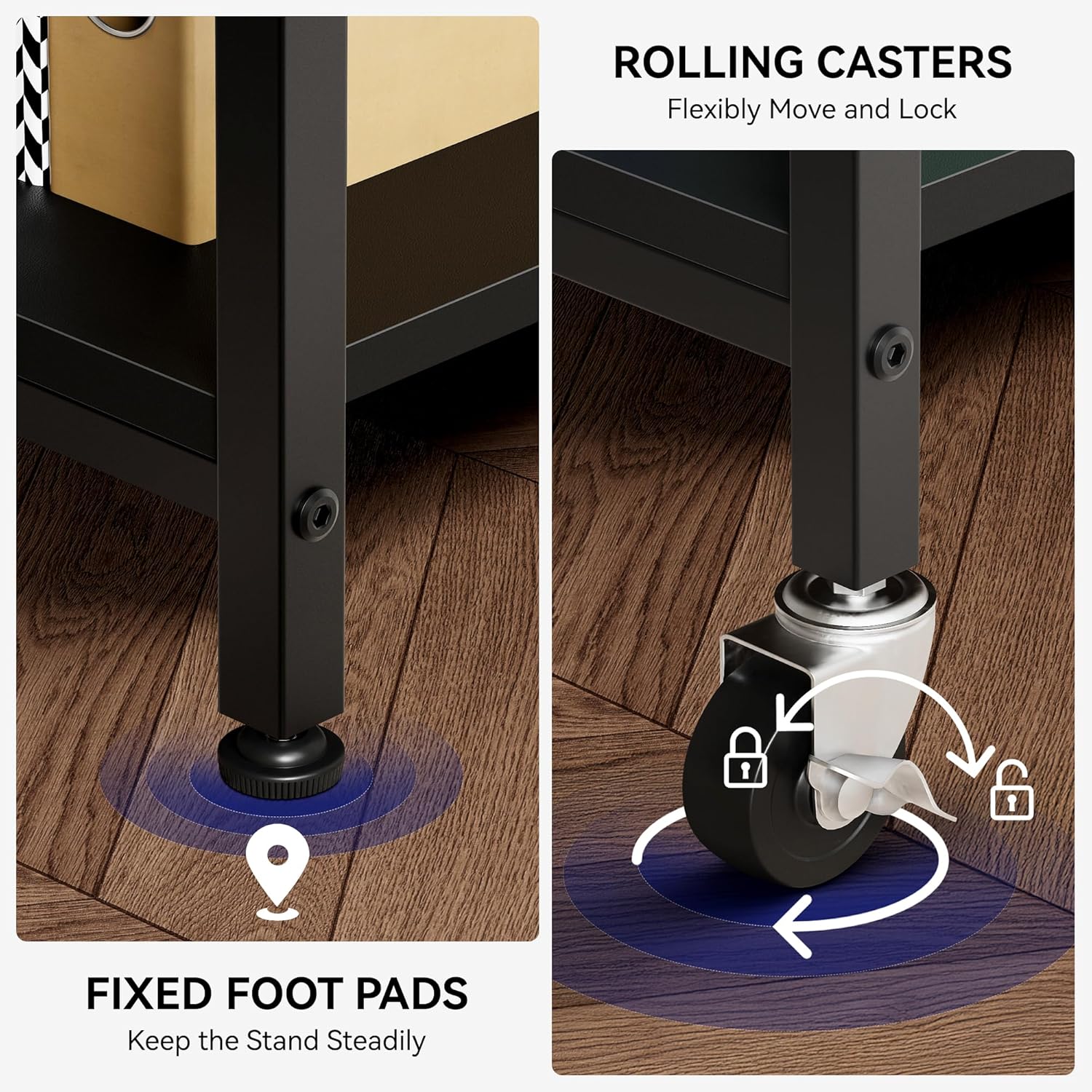 - 【Rolling Printer Stand with Adjustable Feet】 This 24x24 printer stand come with fixed foot pads and rolling casters, you can choose between full stability or mobility. 2 of the 4 wheels are lockable to keep the printer cart in position. The foot pads can be fine-tuned to prevent wobbling on uneven surfaces, guaranteeing a stable and secure stand.