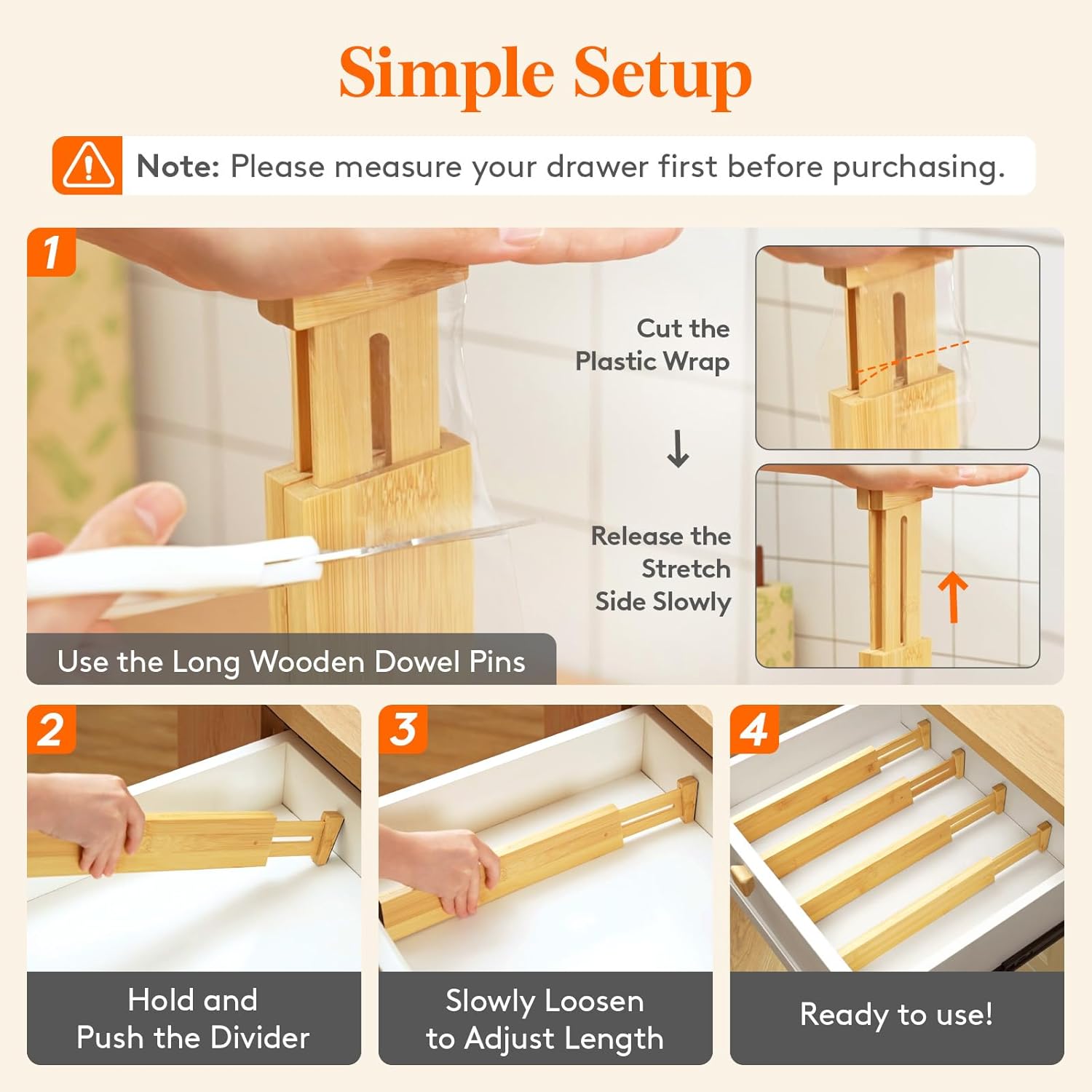 - Refined Material: Our kitchen drawer divider is made from high-quality, medium-tension springs that won’t damage your drawers, while scratch-resistant pads at the ends protect your drawers from marks or residue, ensuring a long-lasting and pristine finish