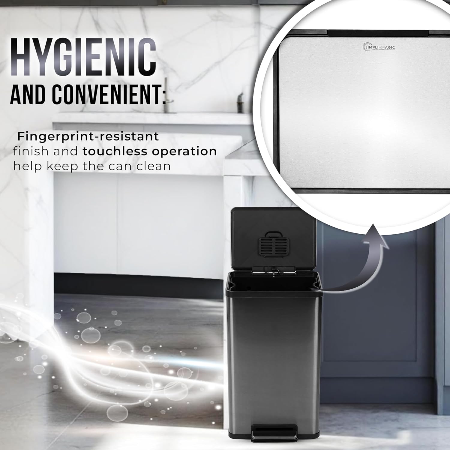 Simpli-Magic 13.2 Gallon (50L) Step Trash Can – Kitchen Garbage Can with Slow-Close Lid – Odor Control, Hands-Free, Easy to Clean, Brushed Stainless Steel