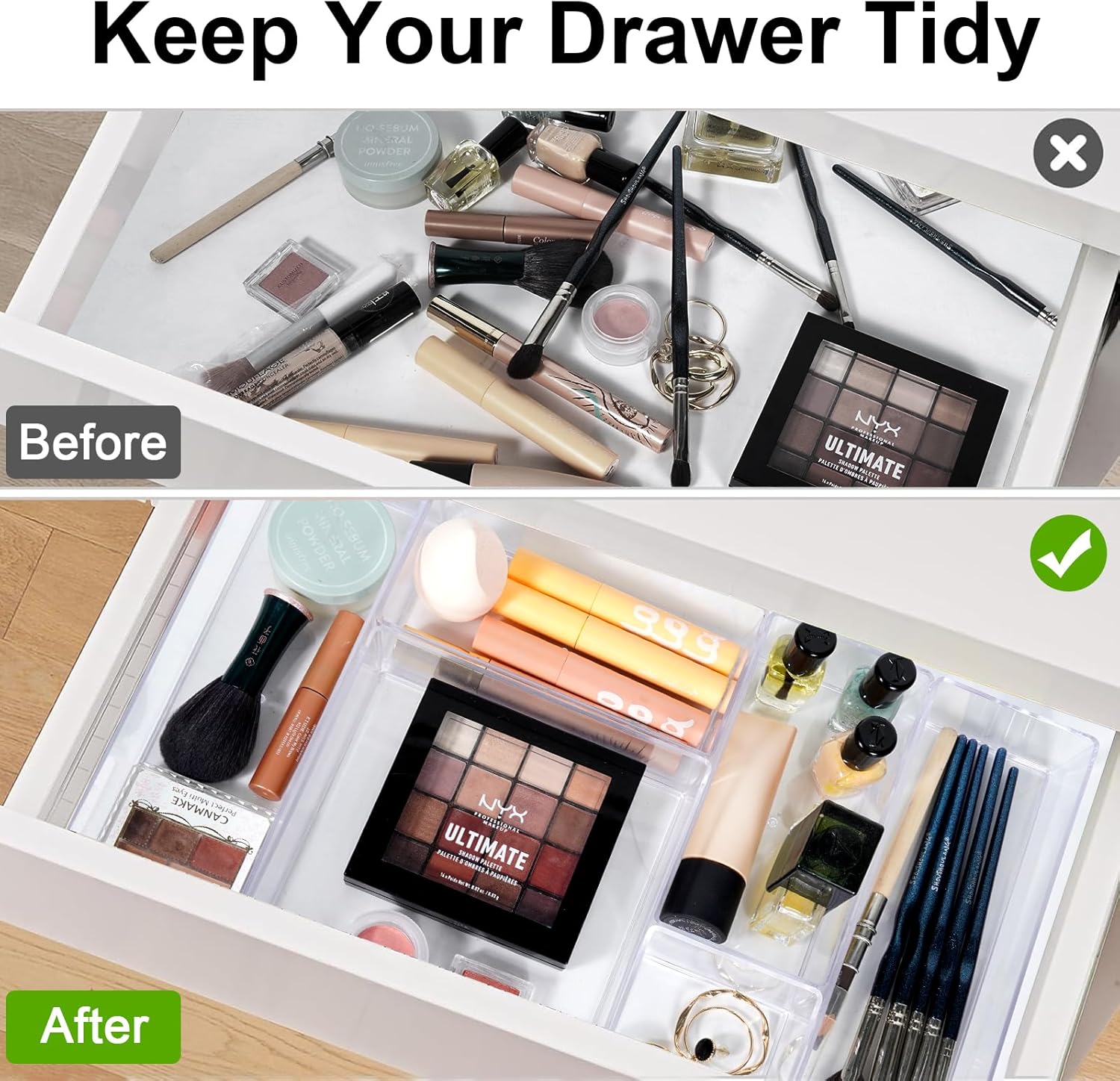 - Multi-Size: Ideal for organizing makeup, jewelry, office supplies, bathroom essentials, and kitchen utensils. The multi-size bins can be used in drawers, on countertops, or on shelves to maximize your storage potential in any room.