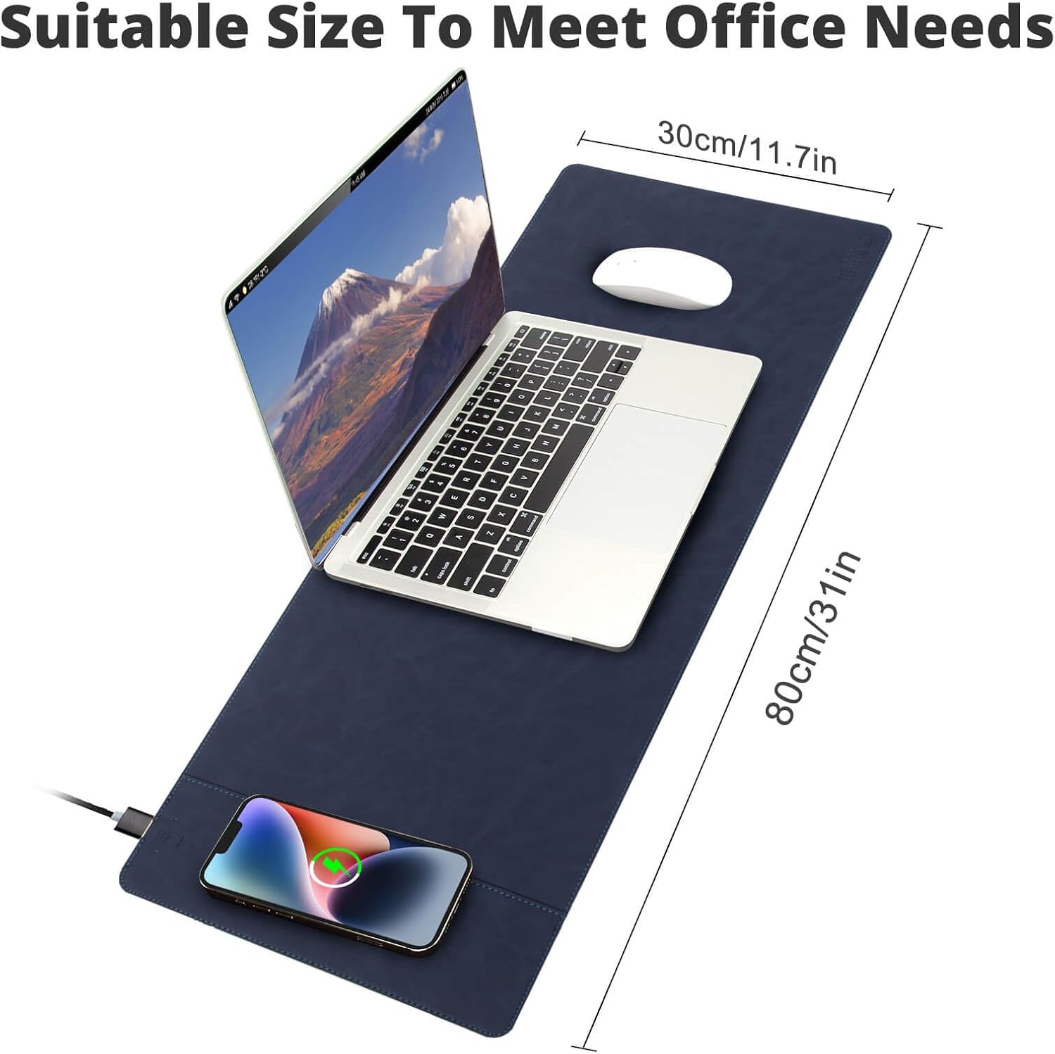 Magnetic Wireless Charging Desk Mat, 31"x11.7" Mouse Pad with Ultra-Smooth Surface, Microfiber Leather Office Mouse Mat, Waterproof Extended Computer Keyboard Desk Mat for Office & Home, Laptop, Blue